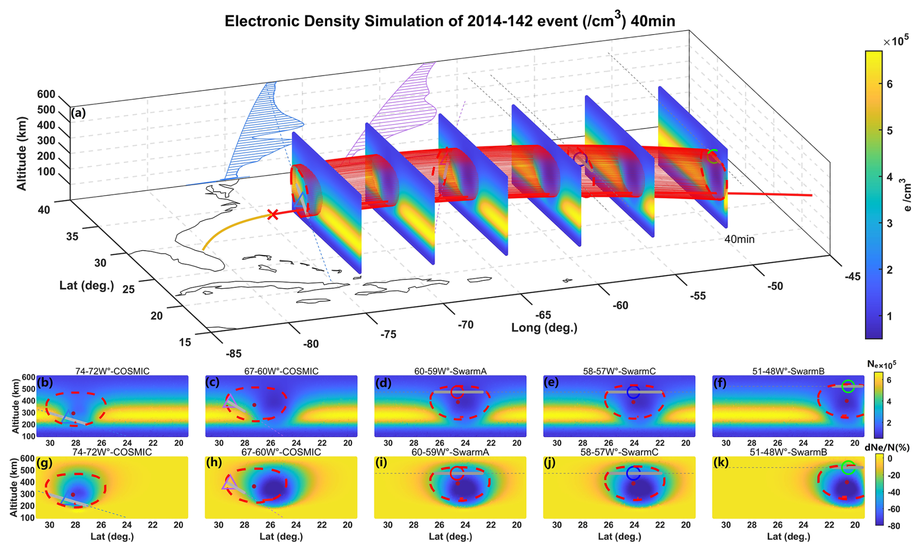 Figure 6Simulated electron density distribution at 40 min and the range of HIREs. (a) The COSMIC-1 data tangent points (marked by dashed lines) with electron density profile projections on the 40° N vertical cross-section. The other marks are the same as Fig. 1. (b–f) The simulated and observed ranges in different latitudinal ranges; (g–k) the percentage change in electron density.