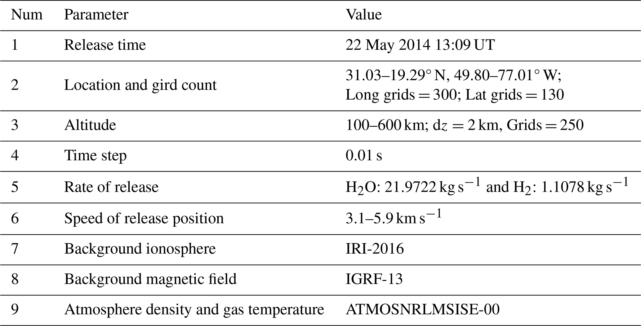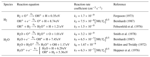 By moving point sources along the rocket trajectory, we simulate continuous rocket exhaust diffusion (e.g. Zhao et al., 2016; Feng et al., 2021). H2O and H2 released into the ionosphere mainly participates in the following reactions as Table 1, to deplete ionospheric electrons: