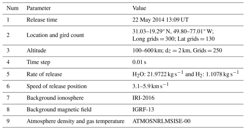 where Isp is the specific impulse, F represents thrust, and m˙ is the released flow rate. The mass flow rate is calculated to be approximately 23.08 kg s−1. Assuming a 5.5:1 oxidizer-to-fuel ratio, the mass fraction of water vapor in the exhaust is estimated to be ∼95 %, and hydrogen ∼5 % (Mendillo et al., 1975).