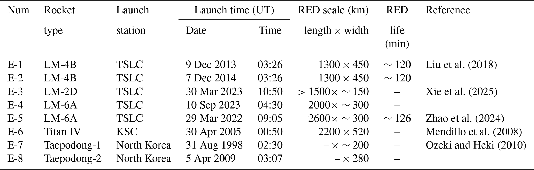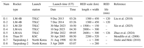 Table 3The Characteristics of RED by Rocket Launch Events in previous studies; TSLC is Taiyuan Satellite Launch Center of China (38.5° N, 111.6° E), KSC is Kennedy Space Center of USA (28.5° N, 80.7° W).