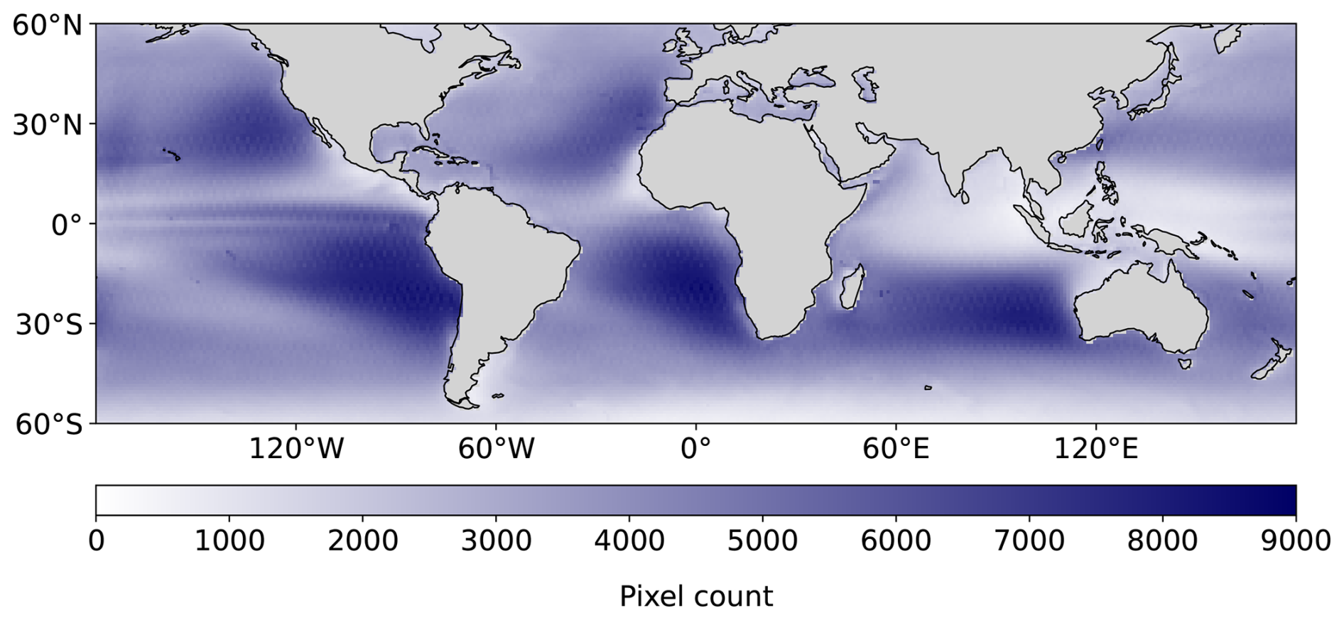 In order to reduce the overall impact of surface albedo variations, the study area was geographically limited to ocean and latitudes between 60° S and 60° N. Only cases with a maximum solar zenith angle (SZAmax) not exceeding 65° were considered, following the threshold used in the G18 sampling strategy for estimating Nd. All data were filtered through cloud fraction of ice clouds (ICF < 0.01) to minimise their contribution to the scene albedo, which restricted the analysis primarily to low-altitude clouds (with cloud top pressure usually above  680 hPa; not shown). The resulting subset of cases considered in this study is pictured in Fig. 1.