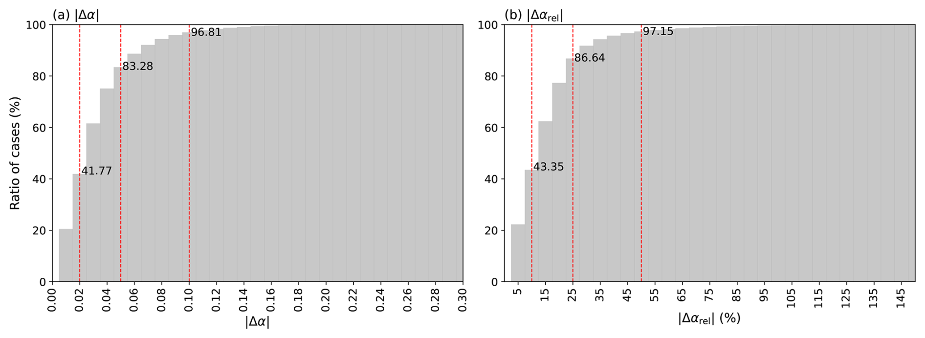 Figure 2Ratio of pixels with correctly estimated albedo as a function of the absolute difference |Δα| (a) and the relative difference |Δαrel| (b) between the estimated (bin-averaged) and observed CERES albedo. The red dashed lines in panel (a) are the thresholds of |Δα| equal to 0.02, 0.05, and 0.1. In panel (b) they are the relative thresholds of 10 %, 25 % and 50 %.