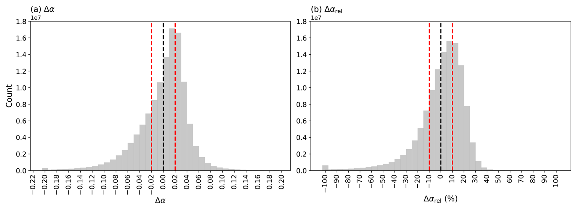 Figure 3Distribution of the absolute difference (Δα) (a) and the relative difference (Δαrel) (b) between the estimated (bin-averaged) and observed CERES albedo. The dashed black line marks zero difference, and the red dashed lines indicate the chosen accuracy thresholds (±0.02 for Δα, ±10 % for Δαrel).