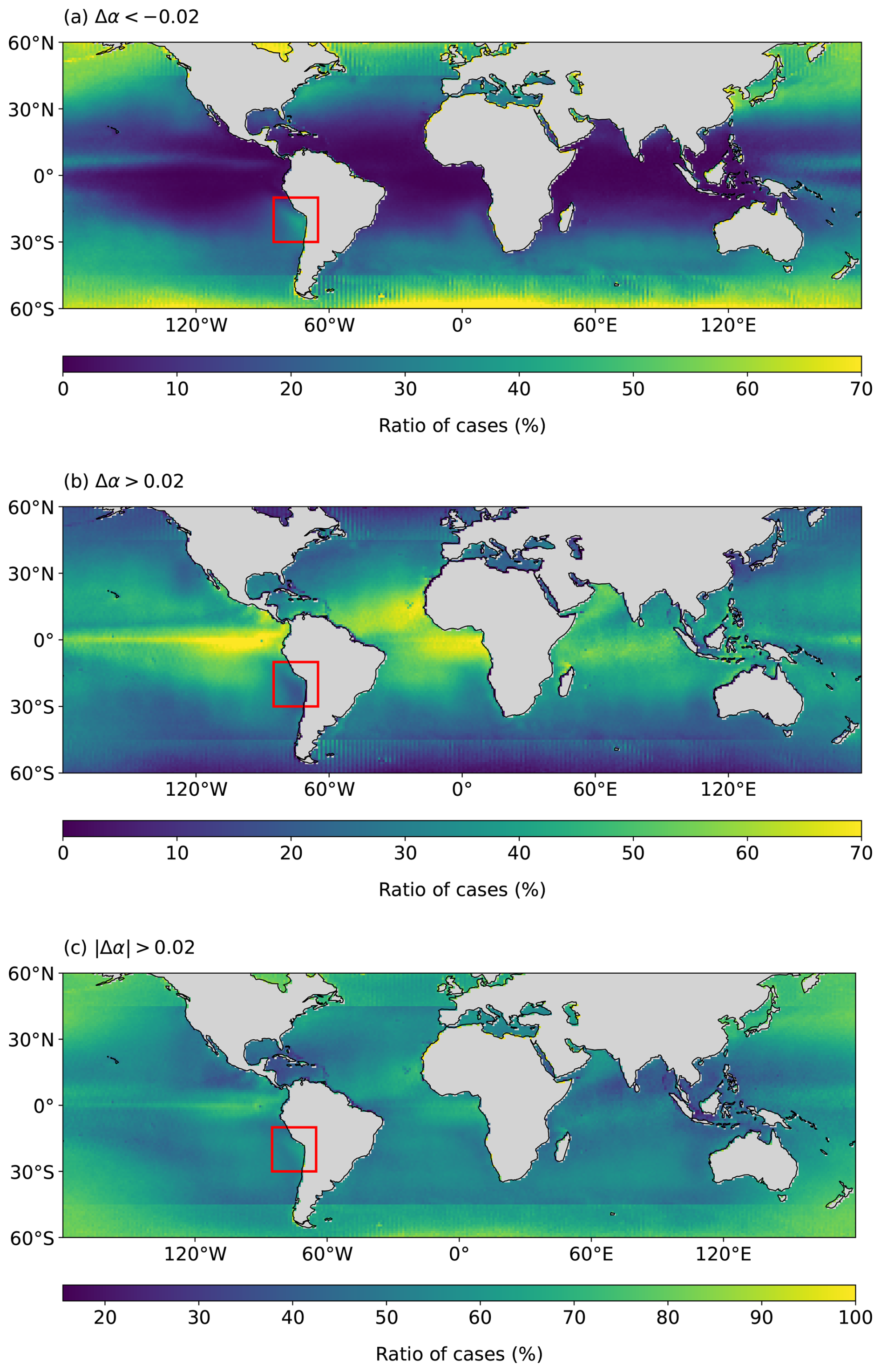 The spatial distribution of the percentage of underestimated and overestimated albedo values, based on the threshold of 0.02, is illustrated in Fig. 4a–b. Both maps reveal well-marked zonal structures. Underestimates of Δα <0.02 are particularly frequent at latitudes poleward of  40° in both hemispheres, whereas they occur relatively rarely in tropical regions. The opposite tendency is observed for overestimates (Δα> 0.02). A clear underestimate of albedo is visible over the regions dominated by marine stratocumulus clouds, with the most distinct example on the west coast of South America highlighted by a red rectangle in all panels of Fig. 4. Underestimates are also apparent in mid-latitudes, within regions influenced by the storm tracks of extratropical cyclones. In contrast, overestimates are most commonly observed along the Intertropical Convergence Zone (ITCZ) over the Pacific and Atlantic oceans, and to some extent over the Indian Ocean. Figure 4c presents the geographical distribution of absolute albedo bias (cases with either underestimated or overestimated albedo by more than 0.02). Generally, albedo biases are mostly evenly distributed spatially, regardless of the number of datapoints at a given location (Fig. 1). In addition to the features of a probable meteorological background, the maps show the presence of some artifacts, which may be related either to the geometry of the observations, such as the solar zenith angle or to the specific features of the retrieval algorithms.