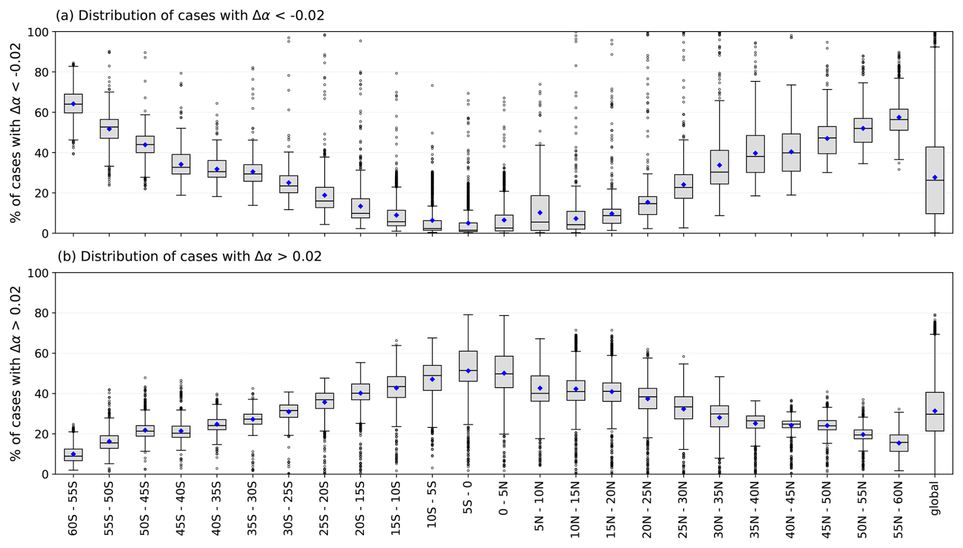 Figure 5Distribution of (a) under- and (b) overestimated cases of albedo across 5° latitude bands. The boxes show the 25th–75th percentile range, with the line inside marking the median. The whiskers extend to the minimum and maximum values. Blue dots indicate the mean, and black dots mark outliers.