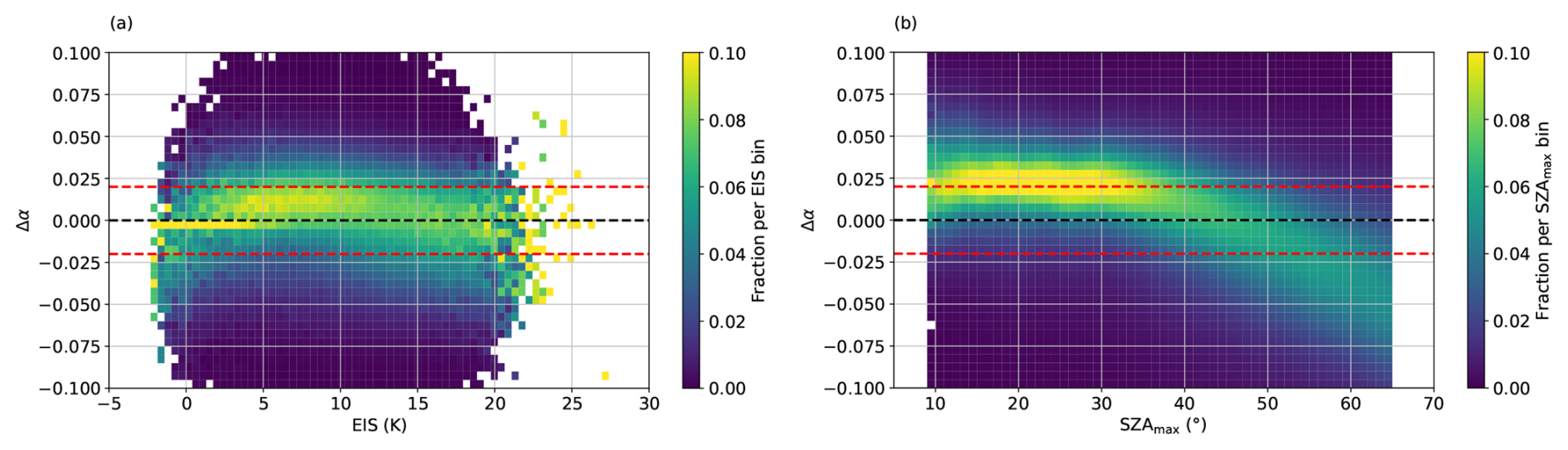 Figure 6(a) The joint EIS–Δα histogram for the 10–30° S, 85–65° W region (Aqua only, 2007–2019), marked with a red rectangle on Fig. 4. (b) The joint SZAmaxΔα histogram for the global ocean (2003–2021). In both plots each column is normalised so that it sums to 1, showing conditional probabilities P(Δα| EIS) (a) and P(Δα| SZAmax) (b). Red dashed lines indicate Δα=0.02 and Δα= 0.02, black dashed line – Δα= 0.00.