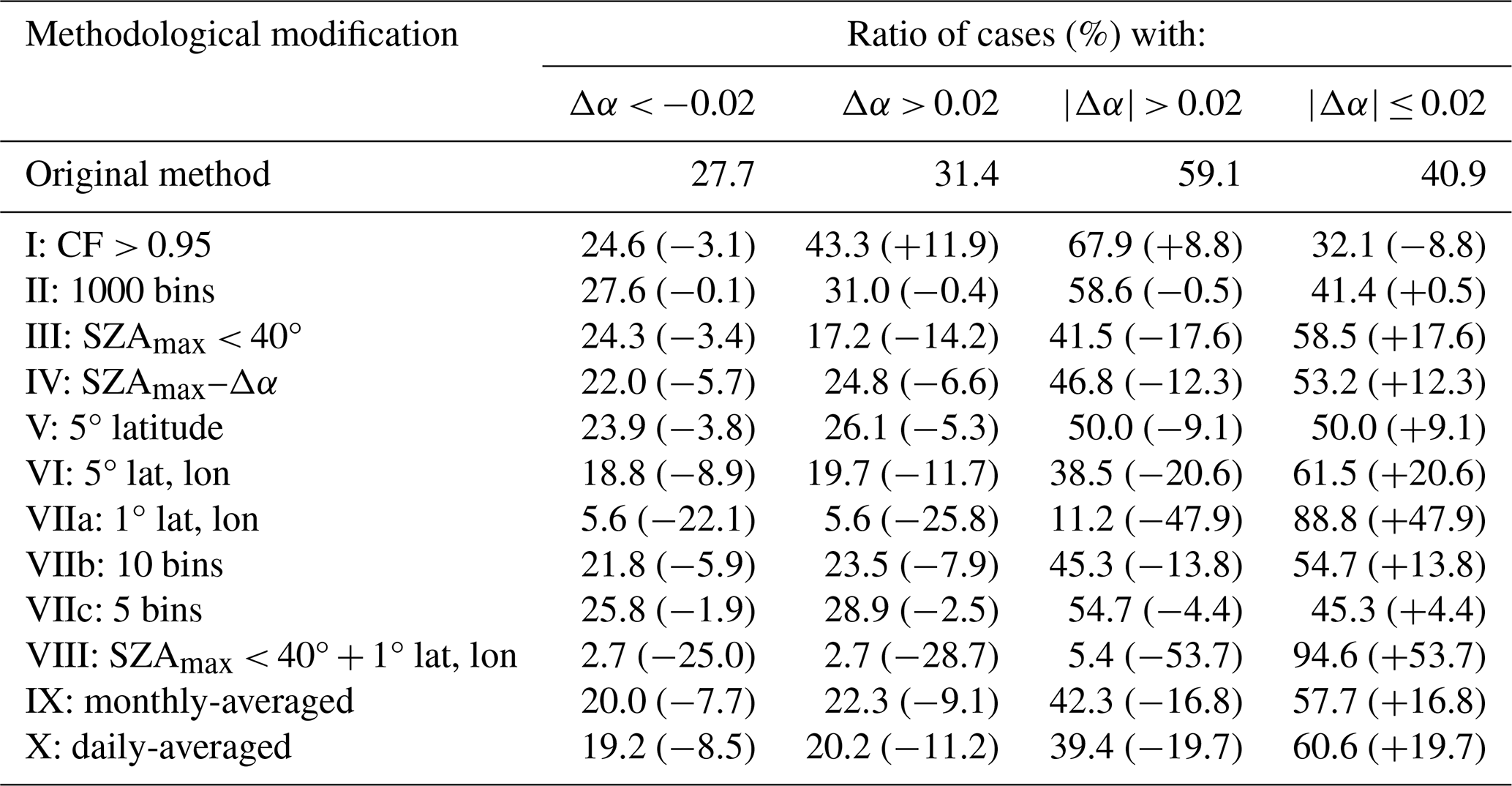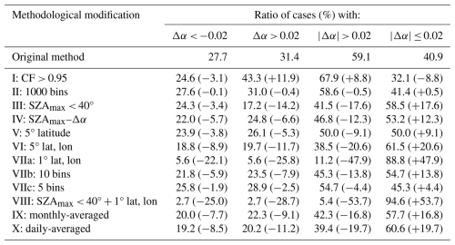 When applying modifications IX and X, an improvement in the method is observed, with the ratio of correct albedo reconstructions increasing from 40.9 % for no temporal aggregation (original method without modifications) to 57.7 % when the kernel is constructed from the monthly-averaged CF, Nd, and LWP and to 60.6 % when it is constructed from the daily-averaged CF, Nd, and LWP (Table 1). However, it should be noted that the daily-averaged version (modification X) may also be subject to bin undersampling, as the number of datapoints available on individual days is considerably smaller than over longer averaging periods. Therefore, the daily results should be interpreted with similar caution as the finest spatial resolution case. Generally, the tests demonstrated that among the investigated modifications, only those accounting for regional and seasonal variability of albedo provided a substantial improvement in the estimates.