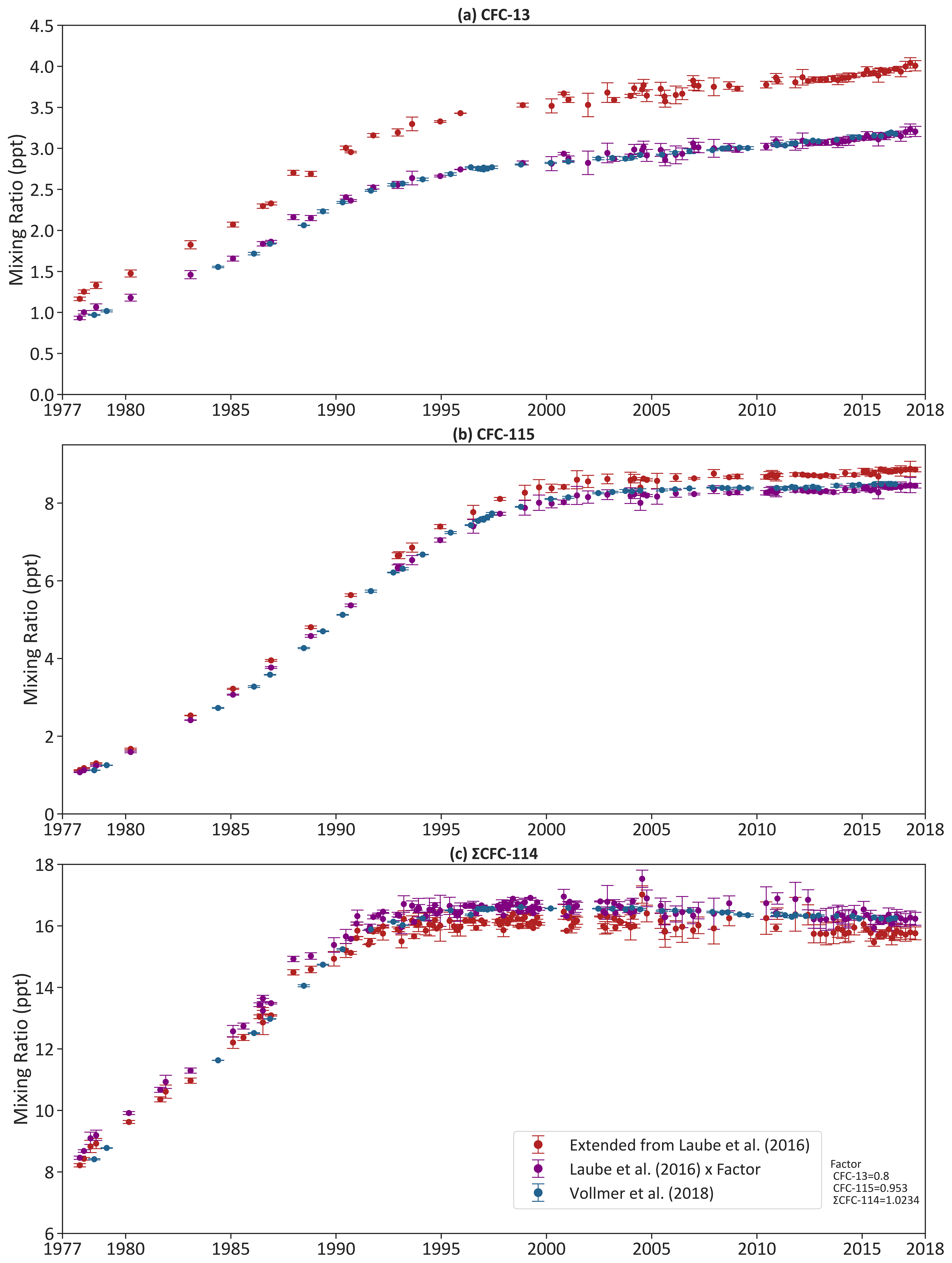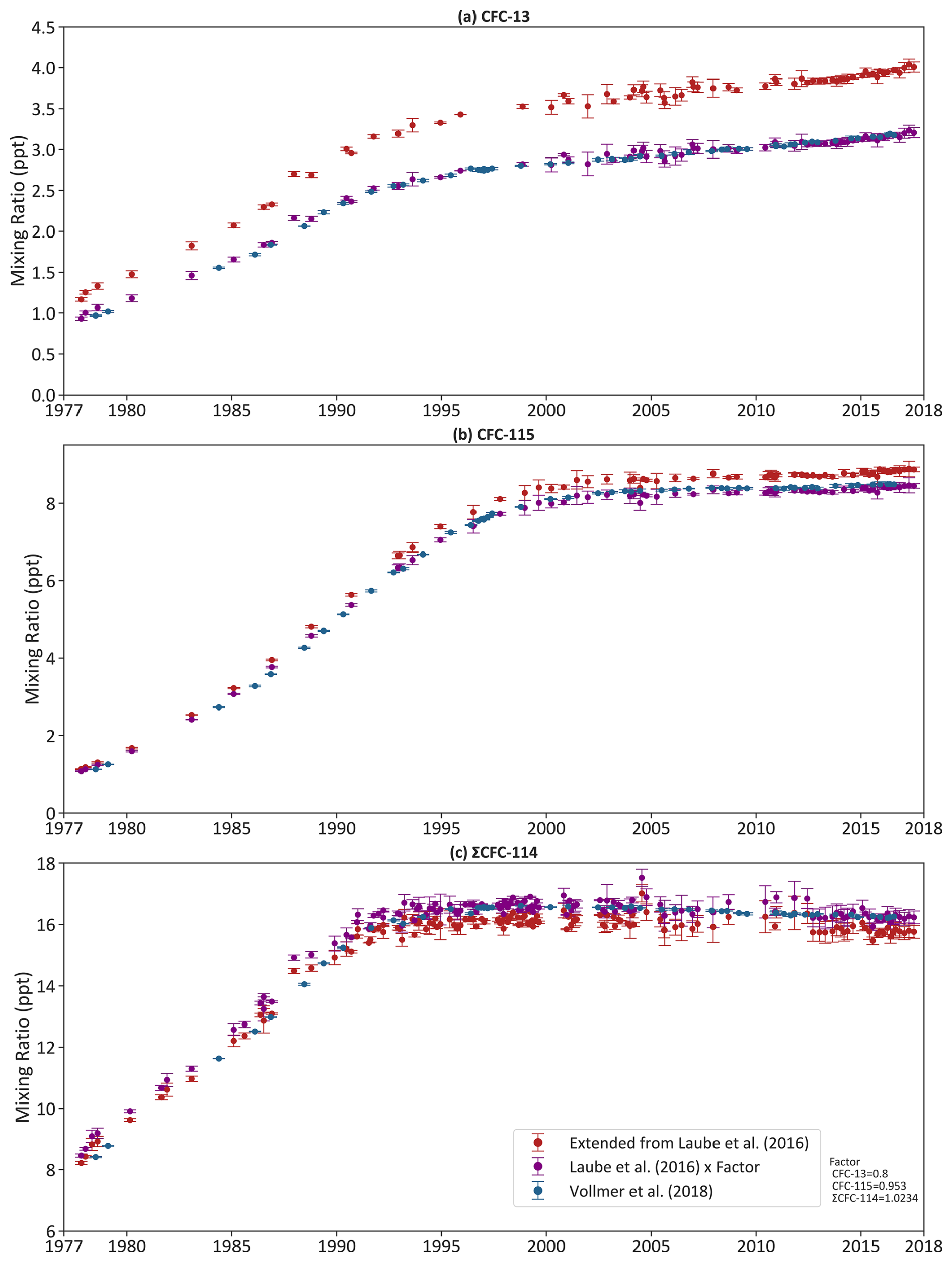 Vollmer, M. K., Young, D., Trudinger, C. M., Mühle, J., Henne, S., Rigby, M., Park, S., Li, S., Guillevic, M., Mitrevski, B., Harth, C. M., Miller, B. R., Reimann, S., Yao, B., Steele, L. P., Wyss, S. A., Lunder, C. R., Arduini, J., McCulloch, A., Wu, S., Rhee, T. S., Wang, R. H. J., Salameh, P. K., Hermansen, O., Hill, M., Langenfelds, R. L., Ivy, D., O'Doherty, S., Krummel, P. B., Maione, M., Etheridge, D. M., Zhou, L., Fraser, P. J., Prinn, R. G., Weiss, R. F., and Simmonds, P. G.: Atmospheric histories and emissions of chlorofluorocarbons CFC-13 (CClF3), ΣCFC-114 (C2Cl2F4), and CFC-115 (C2ClF5), Atmos. Chem. Phys., 18, 979–1002, https://doi.org/10.5194/acp-18-979-2018, 2018.