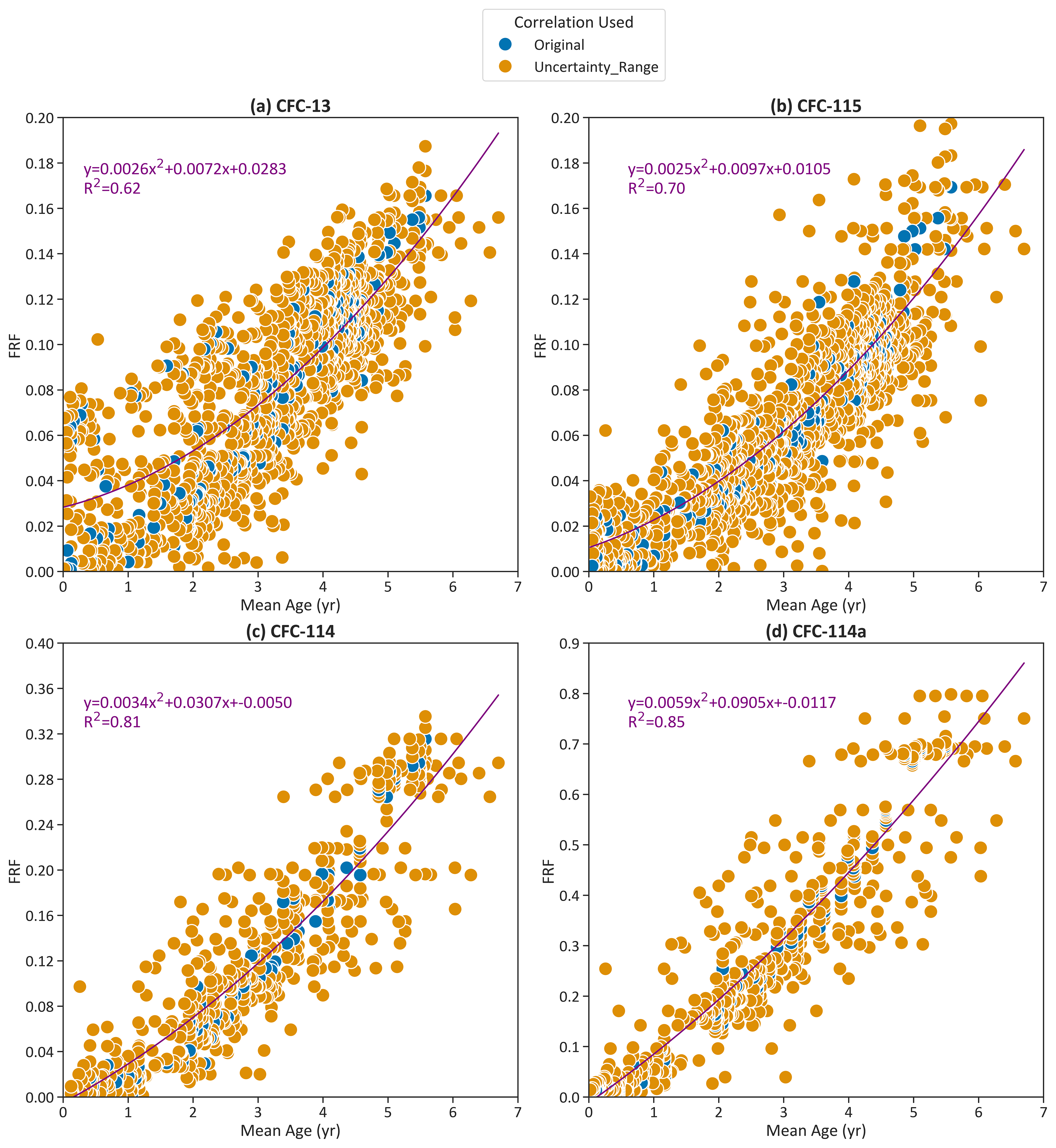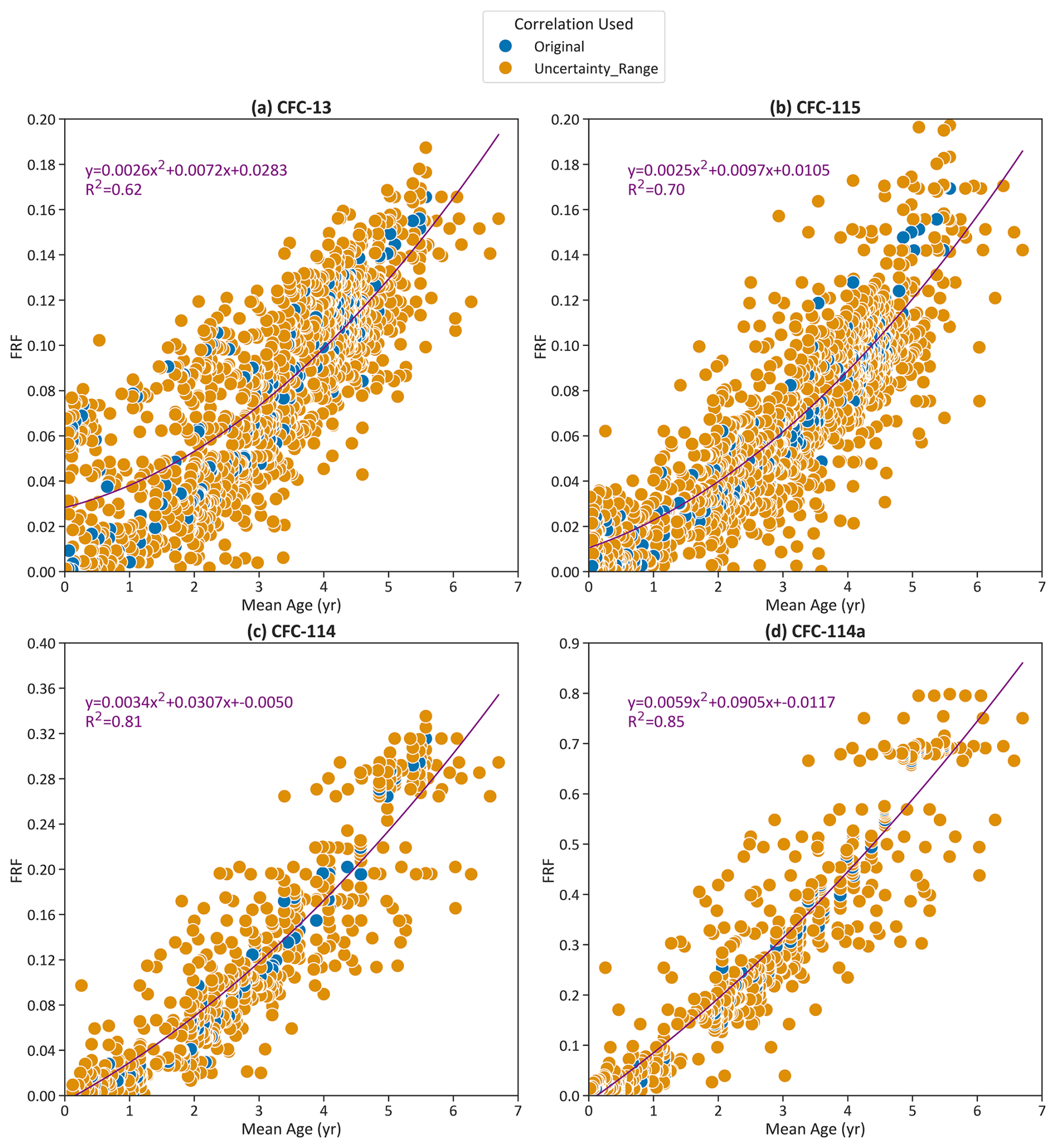 To derive an estimate for the uncertainty, we calculated the FRF using the mean and the upper and lower limits of the measured mixing ratios and mean ages, in similar fashion to Laube et al. (2020). Then, using the combined data set for each compound, FRF was plotted against mean age and a 2nd order polynomial trendline was determined through the data (see Fig. 2).