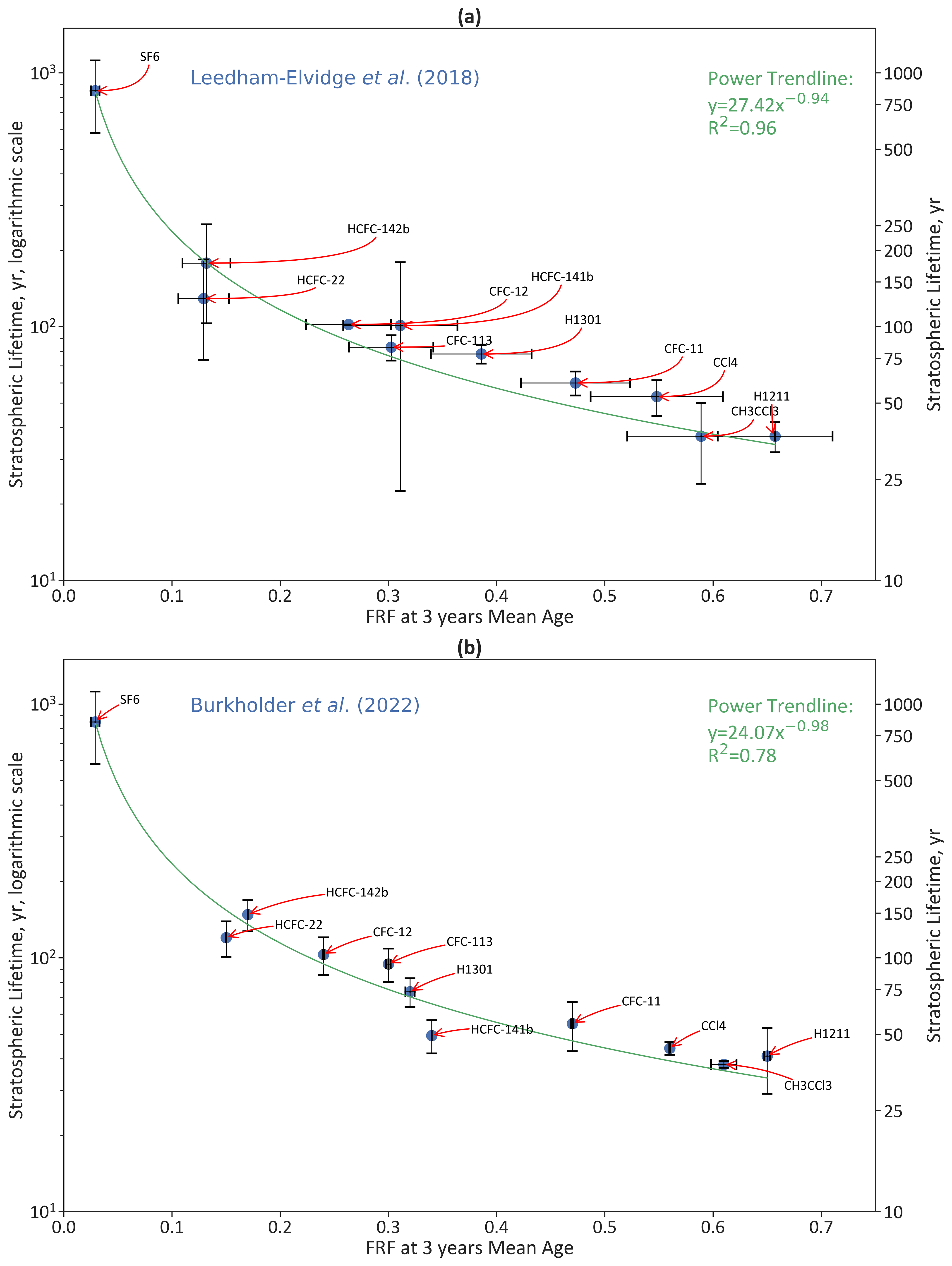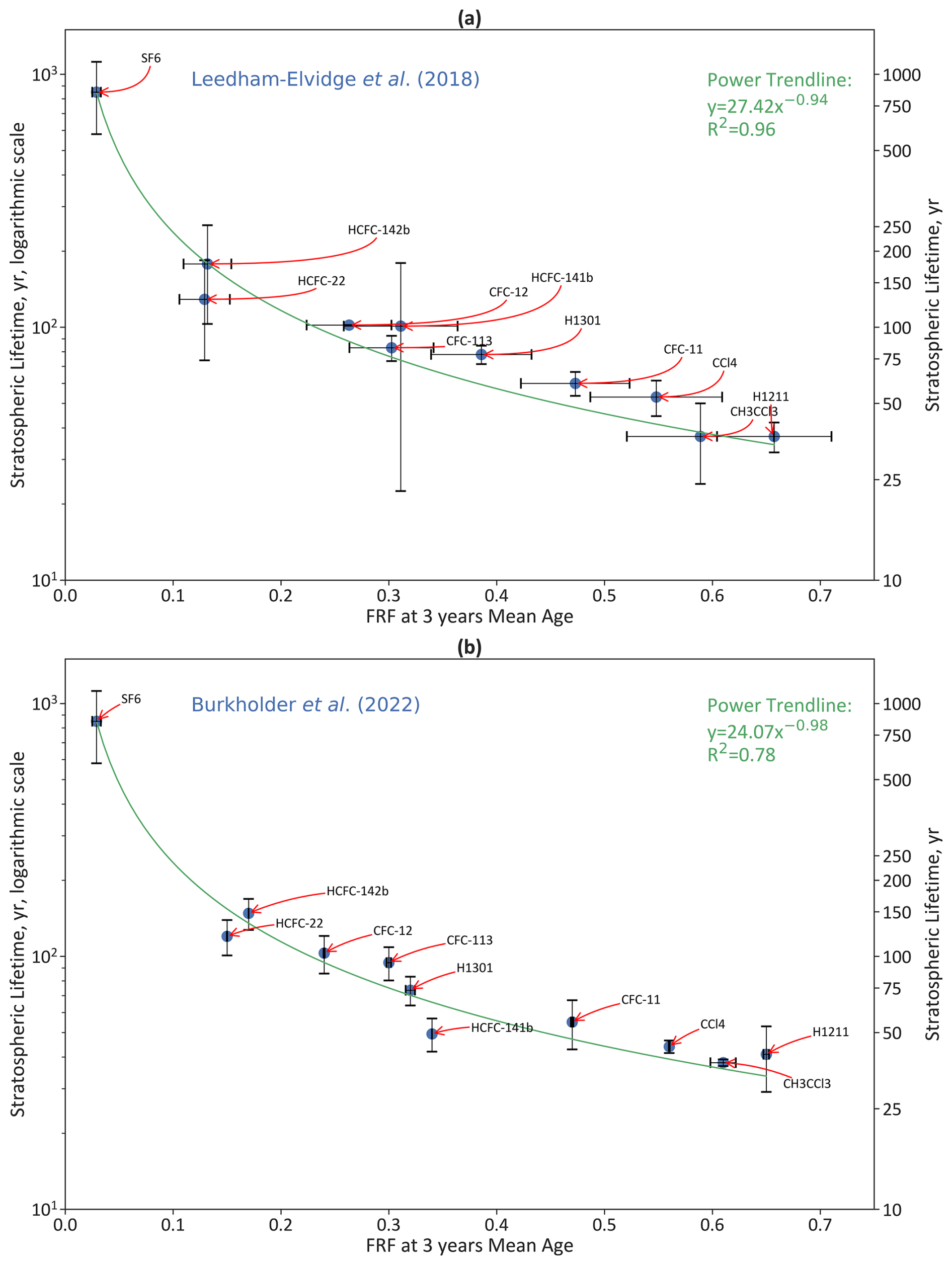 Figure 3Plotting FRF at 3 years mean ages against Lifetime (years) for mid latitude. FRFs, lifetimes, and lifetime uncertainties from (a) Leedham-Elvidge et al. (2018), and (b) Burkholder and Hodnebrog (2022). With the exception of SF6, where the lifetime from Ray et al. (2017) is used. FRF uncertainties were derived from instrument precision and the uncertainty range generated by the bootstrapping procedure. Some compounds (notably SF6) have small enough uncertainty ranges that they are hard to distinguish. No uncertainty values were provided for CCl4's lifetime estimate, so it is missing the y error bar. Included in the plot are the “power” trendline equation and R2 value.