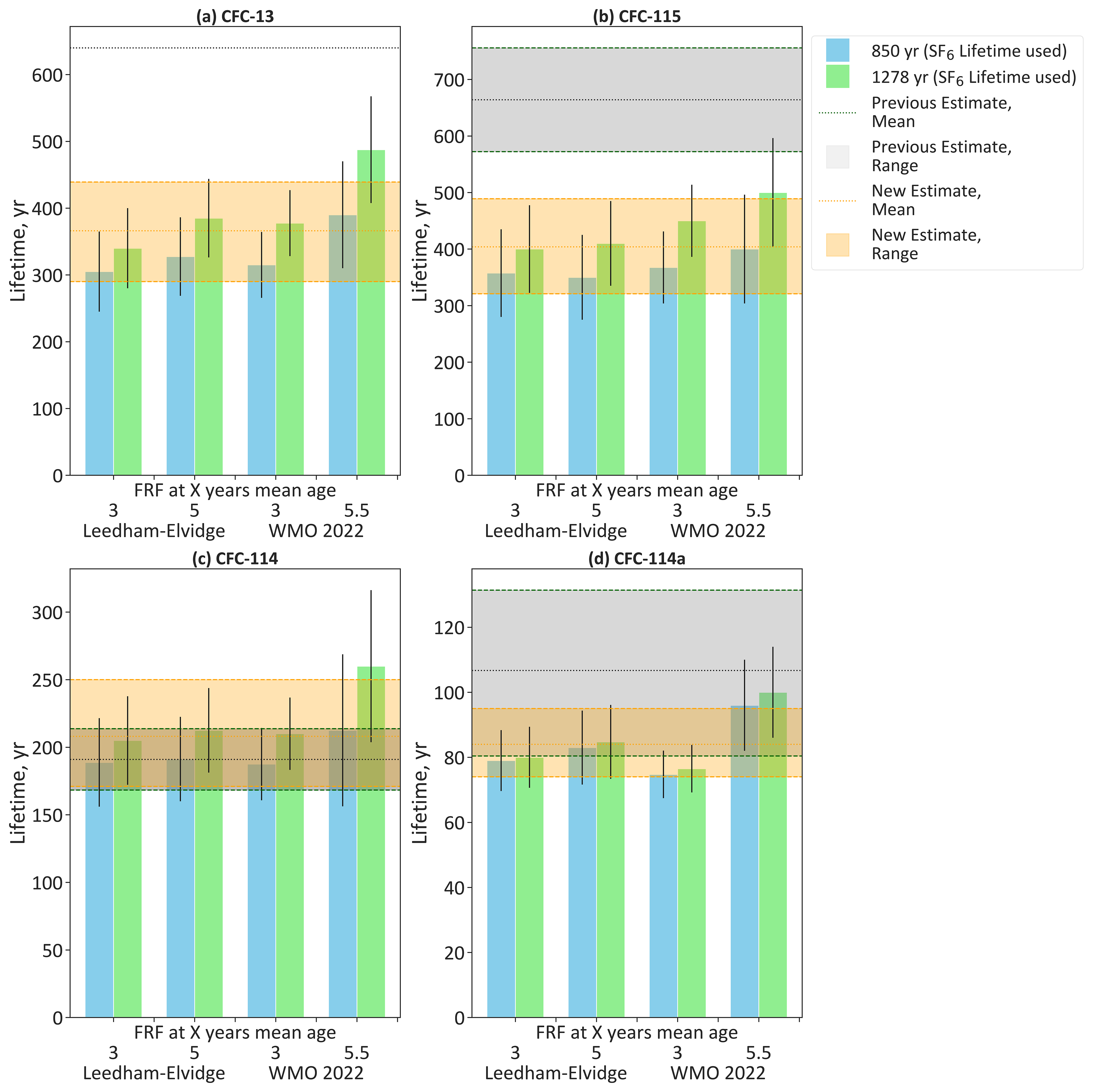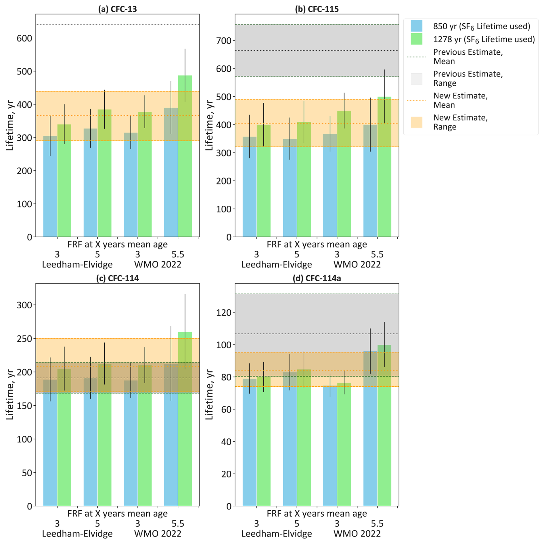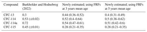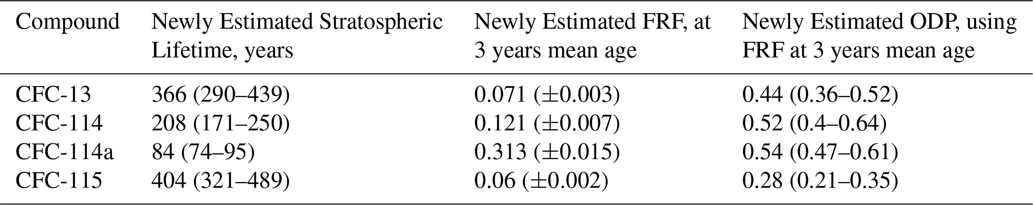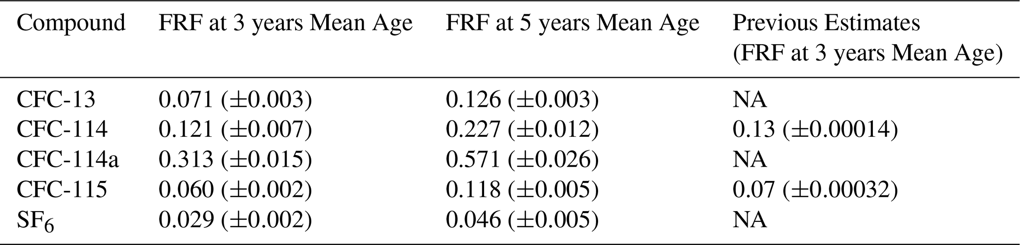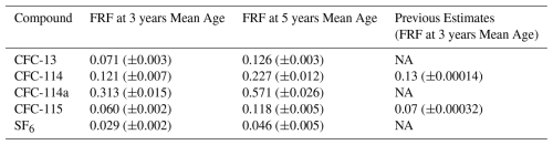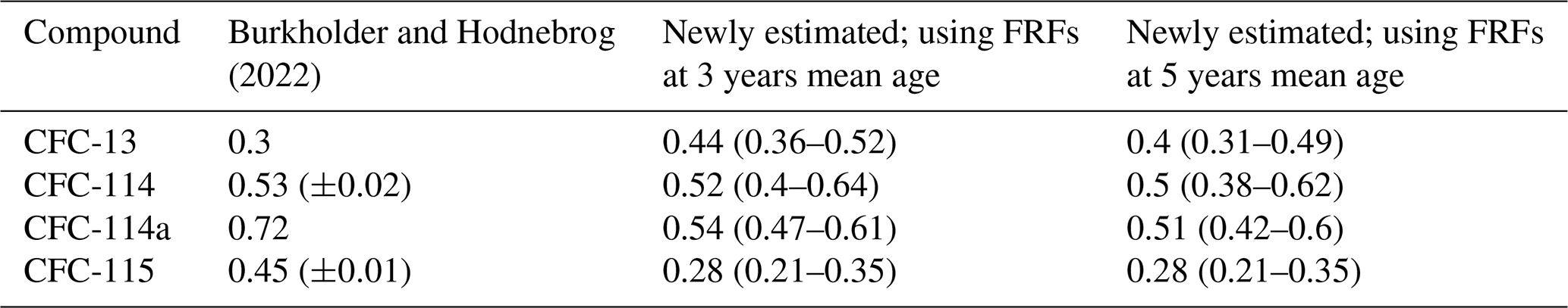 In Table 2 we see that for the two compounds where we have previous estimates for FRF at 3 years mean age (CFC-114 and CFC-115), the newly derived estimates are lower than the previously derived estimates. For CFC-13 and CFC-114a, FRFs at 3 years mean age are not listed in Burkholder and Hodnebrog (2022), so this data represents an expansion of our knowledge of these compounds.