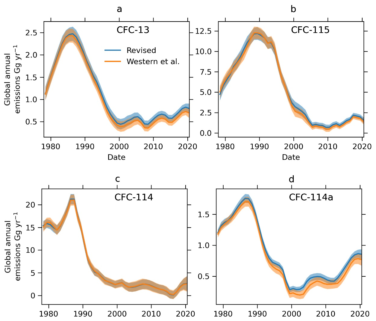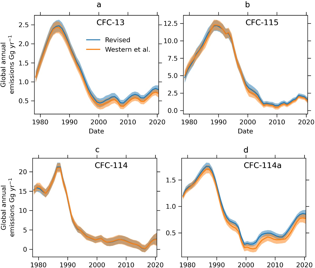 The question remains whether these increased global emission estimates for CFC-13 and CFC-115 are due to release from long-term banks, or from new emissions. Estimates of bank emissions vary widely as they are estimated using different techniques which utilise incomplete or imprecise information (TEAP, 2009; Lickley et al., 2020). Lickley et al. (2022) argues that production assumptions for several CFCs (including CFC-115 but not CFC-13) have a low bias stemming from under-reporting, leading to published bank estimates that also have a low bias, and thus banks are likely to be larger than previously assumed. This is consistent with Fig. 5 where the decreased lifetimes estimated in Sect. 3.1 resulted in greater estimated emissions.