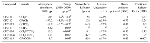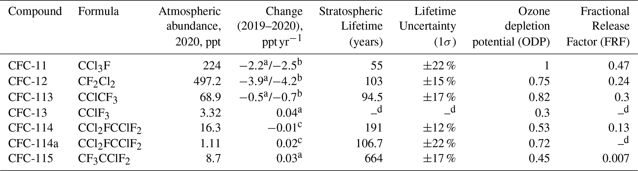 Table 1Previously published data for the compounds considered in this study, presented here for reference and to enable direct comparison with the results of this work. The table lists molecular formulae, abundances, changes in abundance between 2019 and 2020, stratospheric lifetimes and associated uncertainties, ozone depletion potentials (ODPs), and fractional release factors (FRFs) (Burkholder and Hodnebrog, 2022; Daniel et al., 2022; Laube et al., 2022). Annual growth rates are based on in situ measurements from both NOAA (https://gml.noaa.gov/dv/site, last access: 6 October 2025) and AGAGE (https://www-air.larc.nasa.gov/missions/agage/, last access: 6 October 2025) for CFC-11, CFC-12, and CFC-113, and from just AGAGE measurements for CFC-13 and CFC-115. CFC-114 and CFC-114a were quantified separately using flask measurements from the University of East Anglia (UEA) and Forschungszentrum Jülich (FZJ), (NOAA and AGAGE CFC-113 measurements likely include contributions from both CFC-113 and CFC-113a). All values are reported to the same significant figures as in their original sources and represent the current state of knowledge for these compounds.