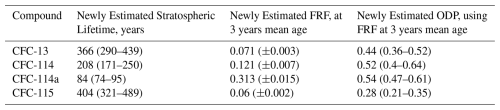 This paper also derives new FRFs and ODPs for these compounds using observational data. Section 3.1 presents newly derived FRFs; CFC-114 and CFC-115 were found to have lower FRFs than previously assumed (Burkholder and Hodnebrog, 2022). CFC-13 and CFC-114a did not have previously published FRFs, and therefore the results presented here address this gap. In terms of ODPs, Sect. 3.2 found that of the compounds studied here, only CFC-114 had ODPs that overlapped Burkholder and Hodnebrog (2022) within the uncertainties. CFC-13 had a larger ODP than previously estimated, while CFC-114a, and CFC-115 had smaller ODPs.