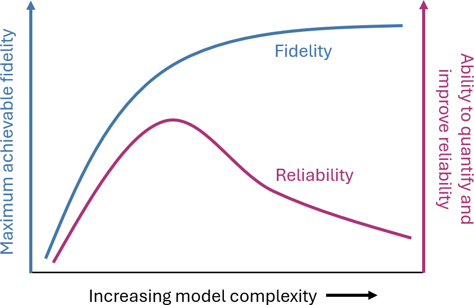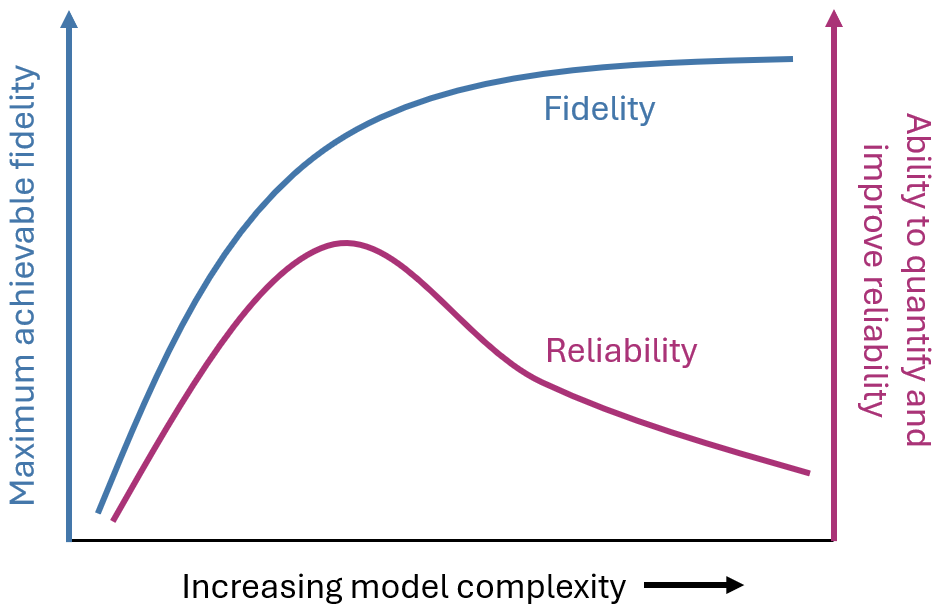 Figure 1Schematic of the model complexity-reliability challenge. Models with greater complexity can in principle achieve higher fidelity. However, higher-complexity models have a larger number of uncertain processes in them, which become increasingly difficult to verify against observations. This is often referred to as over-fitting. Complex models are also slower to run, which limits how the tools of uncertainty quantification and reliability assessment, such as PPEs, can be applied.