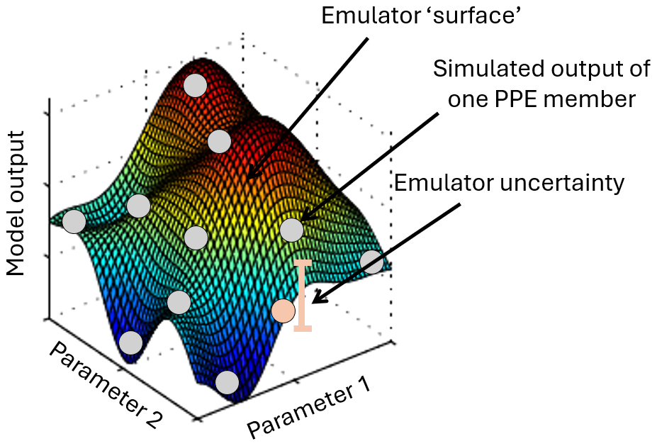 Figure 2A perturbed parameter ensemble and an emulator trained on the data to describe a mapping between the input parameter values and the model outputs across a multi-dimensional parameter space. The emulator can then be used to generate millions of “model variants” for any combination of parameter values for statistical analysis.