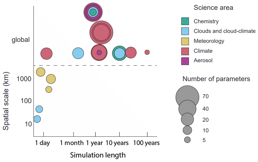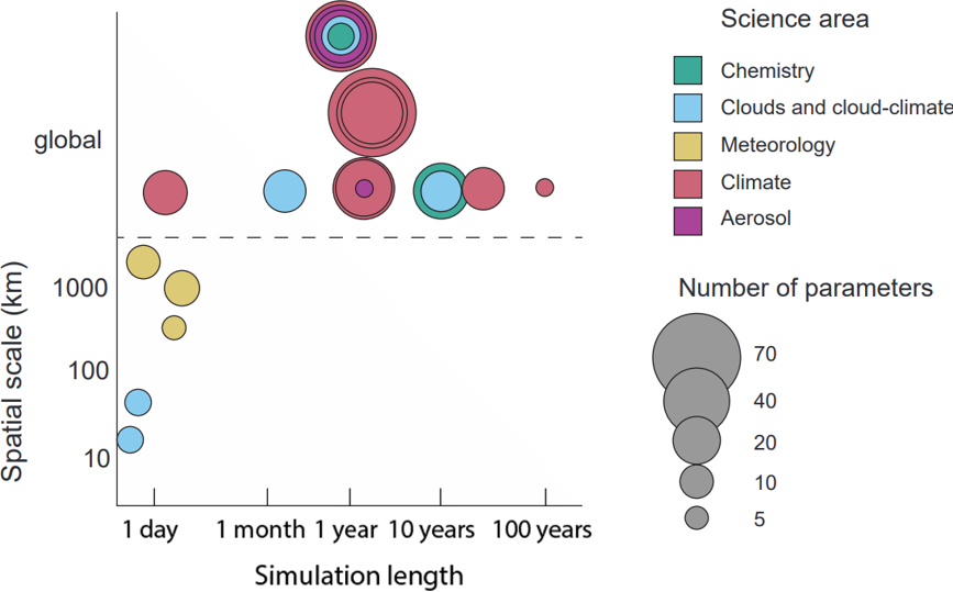 Figure 3PPEs in climate and atmospheric science presented at the WCRP APPEAR workshop. The area of each point scales with the number of parameters that were perturbed. The simulation length represents the time horizon of the simulations of each individual PPE member.