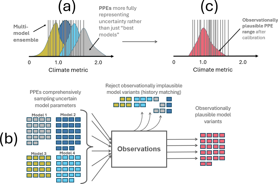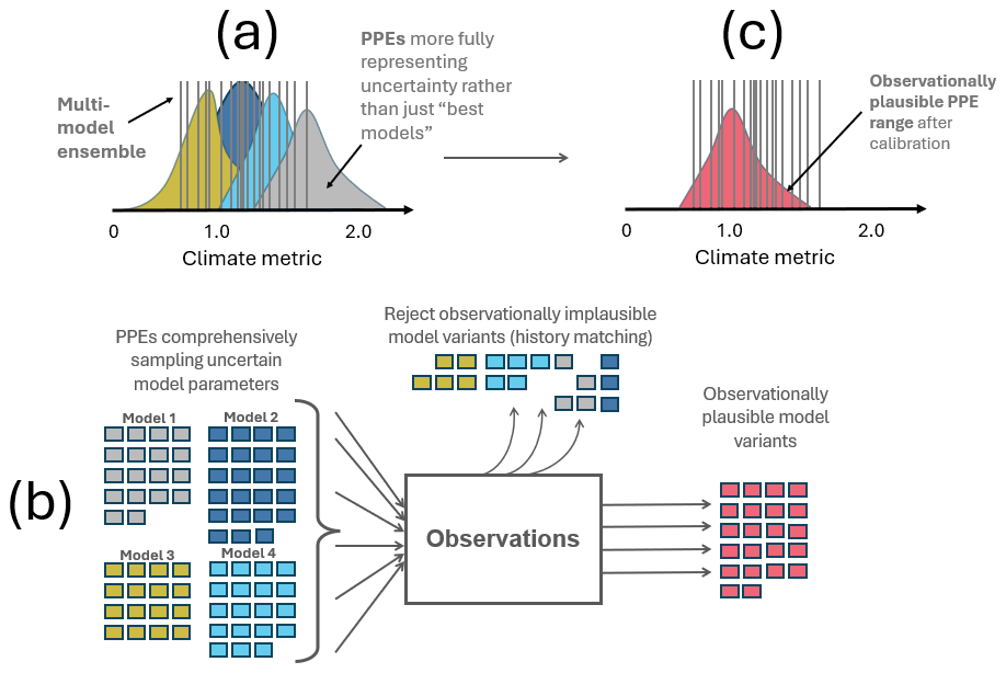 Systematic inclusion of PPEs within MMEs opens up the potential for fuller, more rigorous multi-model calibration. A multi-model PPE (MMPPE) combined with emulators to generate dense samples of model data (Fig. 2) would offer new opportunities to exploit statistical history matching (Craig et al., 1997; Lee et al., 2016; Williamson et al., 2013) or other calibration methods to observationally constrain climate metrics – Fig. 4b. In contrast, the unquantified mix of dozens of model structural, parametric and initial-condition uncertainties represented by an extremely small number of MME members makes it statistically inappropriate to constrain the spread by down-weighting single models (Knutti et al., 2010) – Fig. 4c. History matching has been used successfully to constrain individual PPEs and would be readily extendable to multi-model PPEs regardless of whether they followed a standardized protocol. Submission of a few PPE members to MIPs that span a range of model behaviours or climate metrics would be an efficient initial approach (Elsaesser et al., 2025; Hourdin et al., 2023; Peatier et al., 2022).