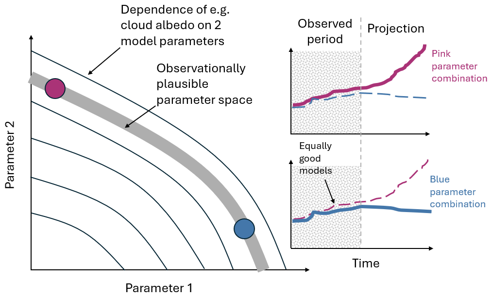 Account for and address model equifinality as a major cause of model unreliability. Equifinality is where different combinations of model parameters or structures produce simulations that cannot be distinguished within the uncertainty of observations (Beven, 2006), but may diverge and cause large uncertainty in predictions or retrodictions (e.g., projections or historical climate simulations – see Fig. 5). In one example related to aerosols (Lee et al., 2016), equifinality was so strong that aerosol observations with arbitrarily small uncertainty had a very weak effect on the uncertainty in aerosol radiative forcing despite both quantities having common uncertain parameters. Equifinality has profound implications for our interpretation of model performance (how well models match observations), which does not guarantee reliable historical or future simulations (Golaz et al., 2013). Without a PPE, it is impossible to assess the scale of this problem.