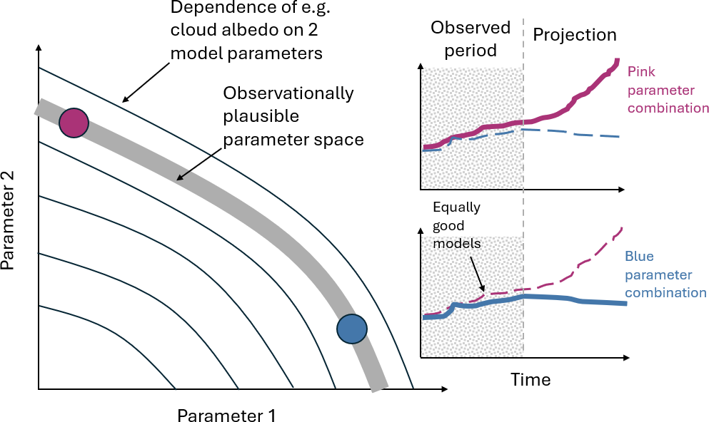 Use PPEs to identify new observations and new ways of using observations to constrain models. PPEs are a valuable tool to not only leverage existing observations better, but also to plan future observations targeted at model constraint. This objective was highlighted by community consensus in the US-CLIVAR sponsored workshop Micro2Macro: Origins of Climate Change Uncertainty (McCoy et al., 2025). There are opportunities, for example, to understand where observations are effective or ineffective at reducing model uncertainty, the processes that cause the remaining uncertainty, and which observations would help to reduce it (Regayre et al., 2026). There are also opportunities to use observations in more creative ways, such as observational constraint of model processes rather than just simulated states, which would help to reduce equifinality. Ultimately, we observe states, not processes, and we must stitch these states together with models to infer causation (Feingold et al., 2025; Hume, 1751). Outside of a few cases (Christensen et al., 2022; Malavelle et al., 2017; McCoy et al., 2018), it is very hard to infer causality from observations of state because of equifinality – many combinations of processes can yield the same state (Gryspeerdt et al., 2019; Stevens and Feingold, 2009; Wood et al., 2012). PPEs provide an opportunity to infer causation from observations (Mikkelsen et al., 2025b).