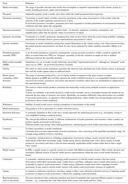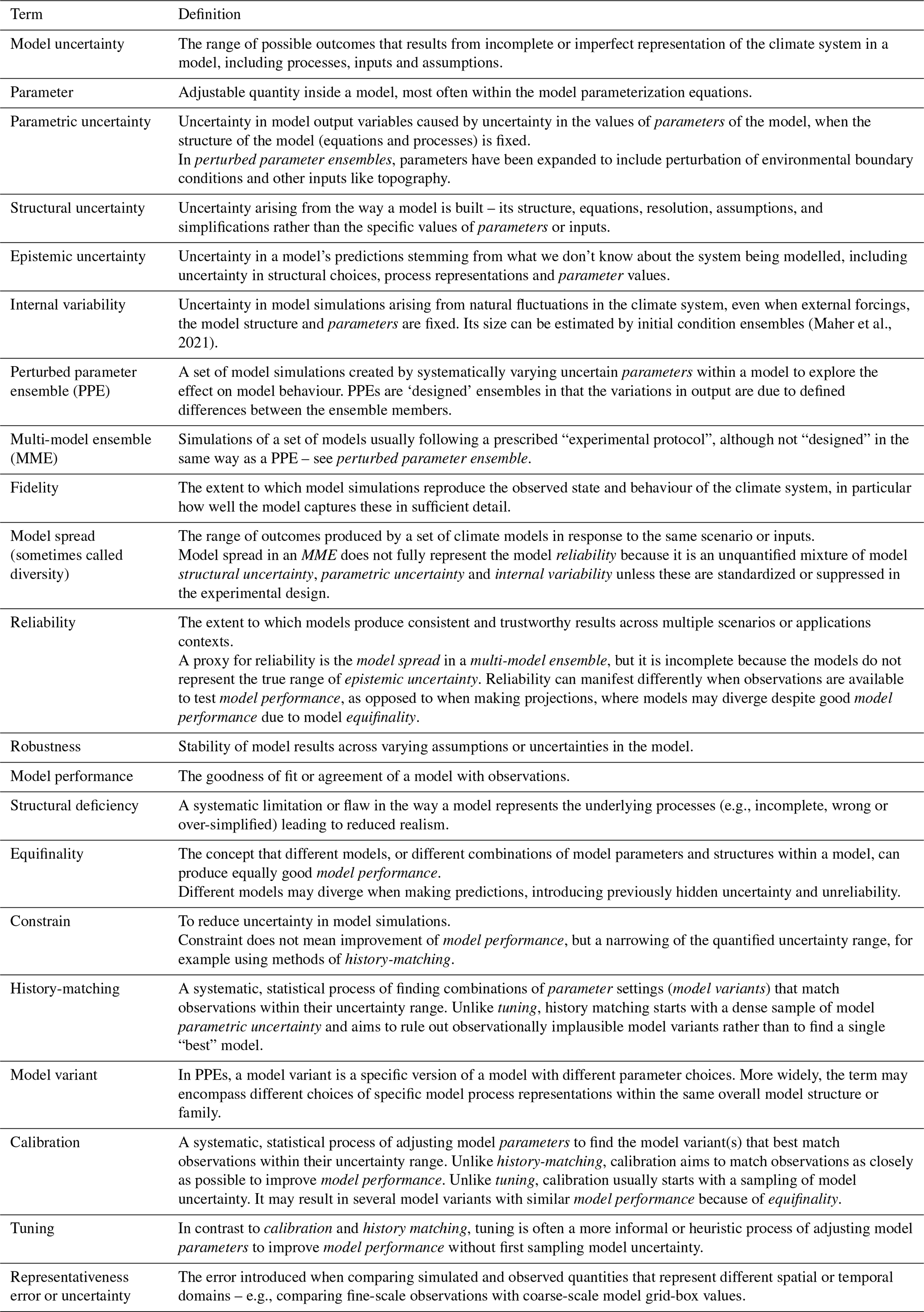 What is the role of perturbed parameter ensembles? The prevailing view is that the uncertainty caused by adjustable quantities inside a model (the parameters – see Table 1) is just a small part of the overall uncertainty challenge – mainly just a component of model tuning. While tuning is essential and universal (Hourdin et al., 2017; Mauritsen et al., 2012), expansion into full perturbed parameter ensembles (PPEs) in which combinations of parameters are systematically perturbed, is given much lower priority than structural changes to models. When a model is structurally deficient – due to low resolution or missing processes – addressing these issues is prioritized, while PPEs are seen as merely “over-polishing” a structurally deficient model. This narrow perspective is one that we challenge here.