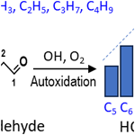 Chacon-Madrid et al. (2010) have conducted a comparative study of the SOA yields in OH-initiated oxidation of n-aldehydes and n-alkanes under high NOx conditions. They reported near identical SOA yields from n-tridecanal and n-dodecane where the precursor alkane is having one less carbon than the precursor aldehyde. The finding was attributed to the formation of C12 alkoxy radical intermediate from both precursors undergoing similar subsequent reactions leading to SOA. This indicates that the dominant fate of aldehyde oxidation by OH leads to the fragmentation of its carbon backbone losing one carbon atom rather than producing functionalized products with the same number of carbon atoms as the parent molecule.