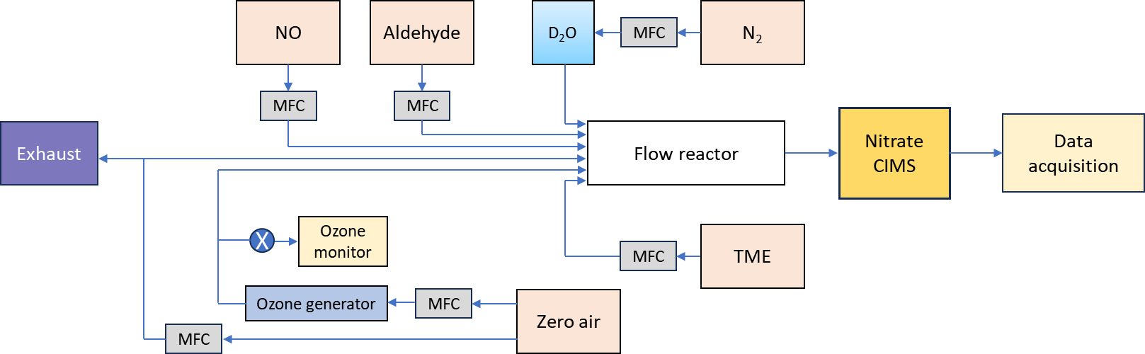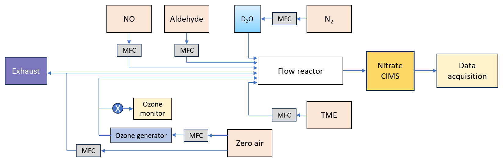 The gas-phase oxidation reactions of n-aldehydes with OH radicals were conducted in a flow reactor setup in the laboratory as shown in Fig. 1. All the experiments were conducted at room temperature and 1 atm pressure of air. The precursor aldehydes were introduced into the reactor from their individual gas cylinders. The oxidant OH radicals were produced in situ by the reaction of tetramethylethylene (TME, C6H12) with ozone. We used an ozone generator that photolyzes zero-air by a mercury lamp (UVP, Analytik Jena) to provide ozone to the reactor while TME was supplied from a gas cylinder. The zero-air was produced by feeding compressed clean air to a zero-air generator (AADCO-737-15) which was also used as bath gas in the reactor maintaining a total sample flow of 8–10 slpm. The initial concentrations of reactant precursors were determined by controlling the individual gas flows using calibrated mass flow controllers (Alicat Scientific). An ozone analyzer (2B Technologies model 205) was used to measure the ozone concentrations. Further details regarding reactant concentration measurements, as well as specifications for the chemicals and gas cylinders, are provided in Sects. S1 and S2 in the Supplement.