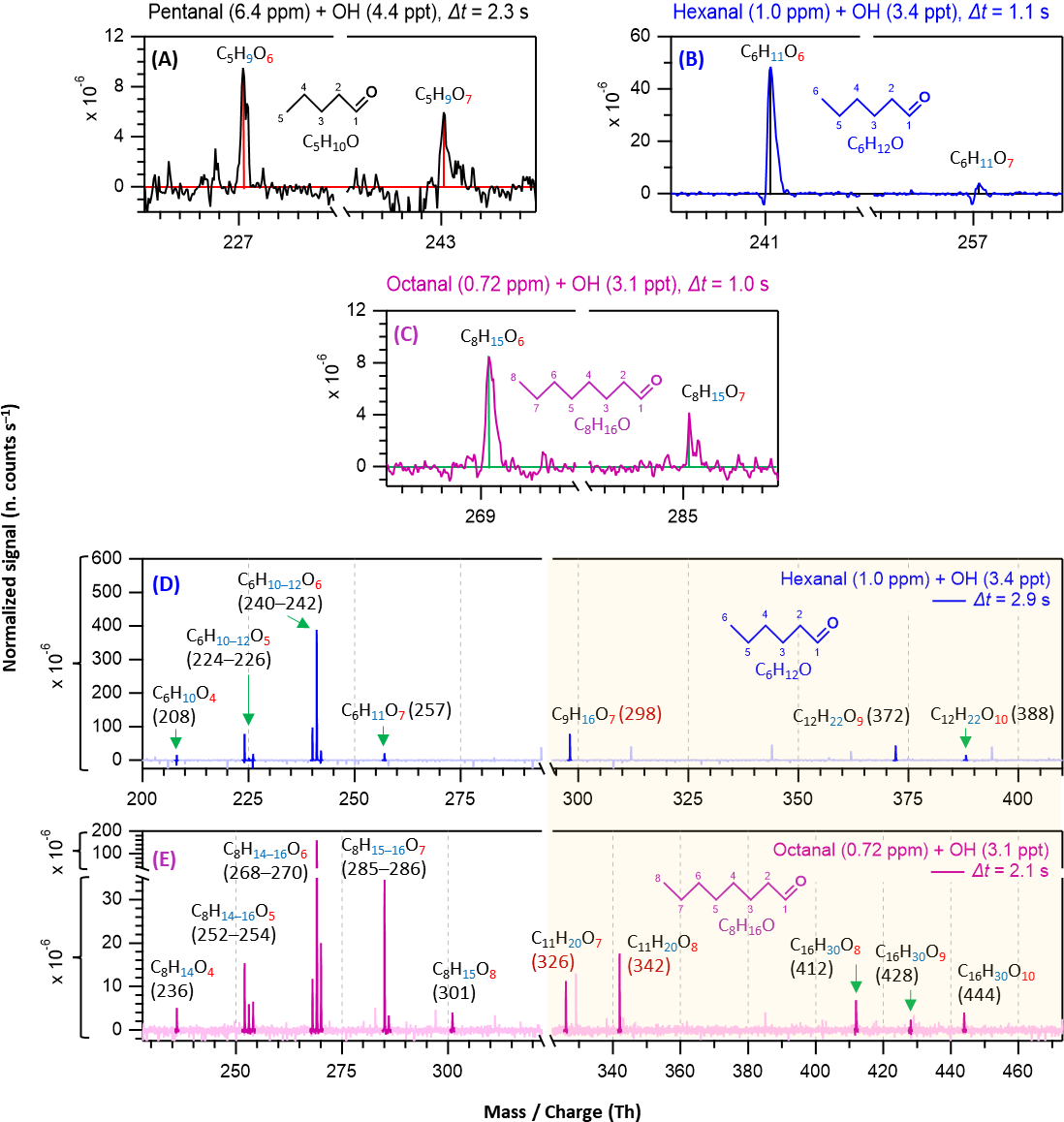 Figure 2Nitrate chemical ionization mass spectra of OH initiated oxidation of n-aldehydes showing the formation of HOMs in different reaction times (Δt): 2.3 s – pentanal in black (a), 1.1 and 2.9 s – hexanal in blue (b, d), and 1.0 and 2.1 s – octanal in purple (c, e). The product peaks are labelled with the exclusion of ion attachment in their compositions. The backgrounds of TME ozonolysis (TME + O3) and aldehyde have been subtracted from all spectra, resulting in several negative peaks in panels (a–e). The accretion product region is highlighted in light gold background. The accretion products labeled with nominal mass/charge in dark red () are related to the TME-derived peroxy radical C3H5O3.