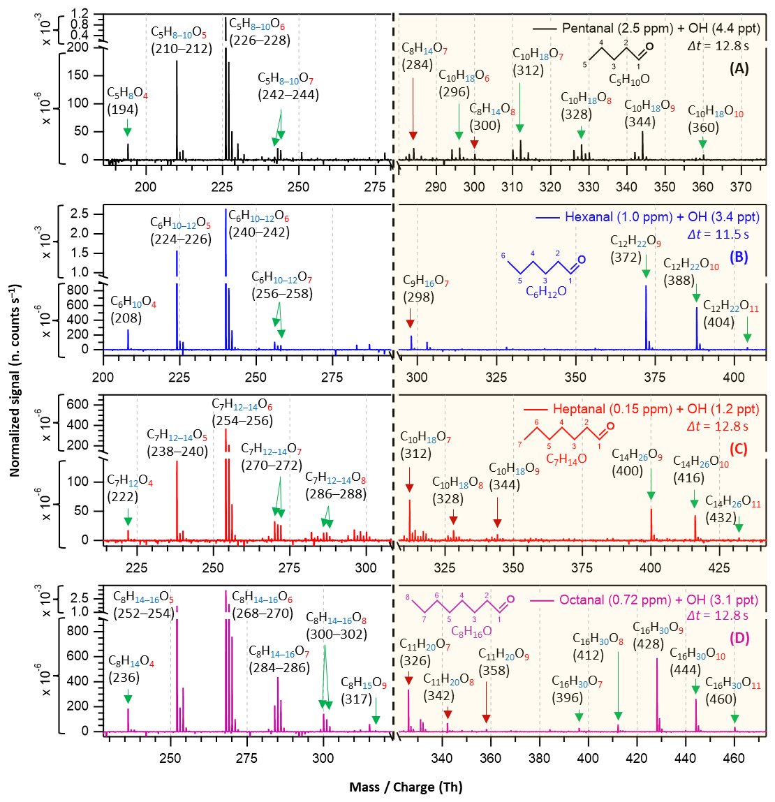 Figure 3Nitrate chemical ionization mass spectra of OH initiated oxidation of n-aldehydes in 11–13 s residence times: pentanal in black (a), hexanal in blue (b), heptanal in red (c), and octanal in purple (d). The product peaks are labelled with the exclusion of ion attachment in their compositions. The backgrounds of TME ozonolysis (TME + O3) and aldehyde have been subtracted from all spectra, resulting in several negative peaks in panels (a–d). The accretion product region is highlighted in light gold background. The accretion products marked by dark red arrows () are related to the TME-derived peroxy radical C3H5O3.