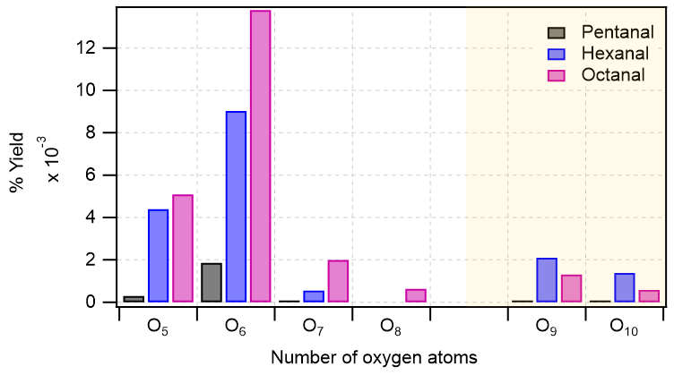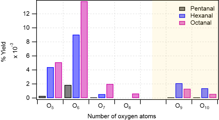 Figure 4Distribution of major oxidation products (O5–O8 in monomeric regime with white background, and O9–O10 in accretion product regime with light gold background) in pentanal, hexanal, and octanal oxidation initiated by OH radical. In y-axis, the numbers are the cumulative sum of yields of products with the same oxygen number. Reaction time, Δt = 11–13 s.