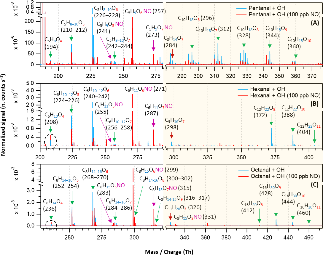 Figure 5Overlaid nitrate chemical ionization mass spectra of OH initiated oxidation of n-aldehydes without (in blue) and with the presence of 100 ppb of initial NO (in red): pentanal (a), hexanal (b), and octanal (c). The product peaks are labelled with the exclusion of ion attachment in their compositions. The accretion product region is highlighted in light gold background. The accretion products marked by dark red arrows () are related to the TME-derived peroxy radical C3H5O3. The organonitrates (in the presence of NO) are labelled with the extension NO and marked with purple arrows. Reaction time, Δt = 11–13 s.