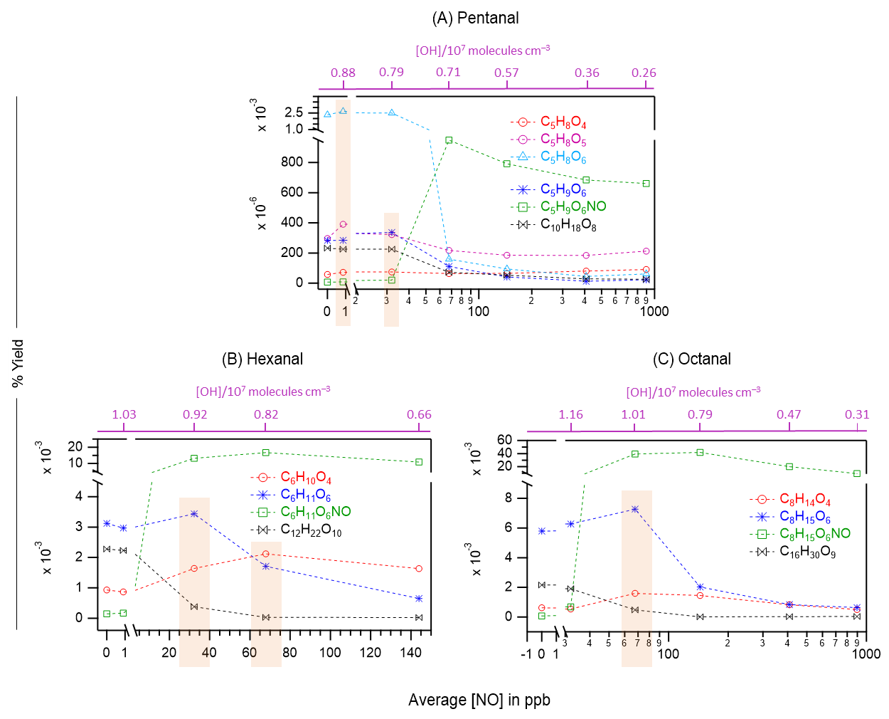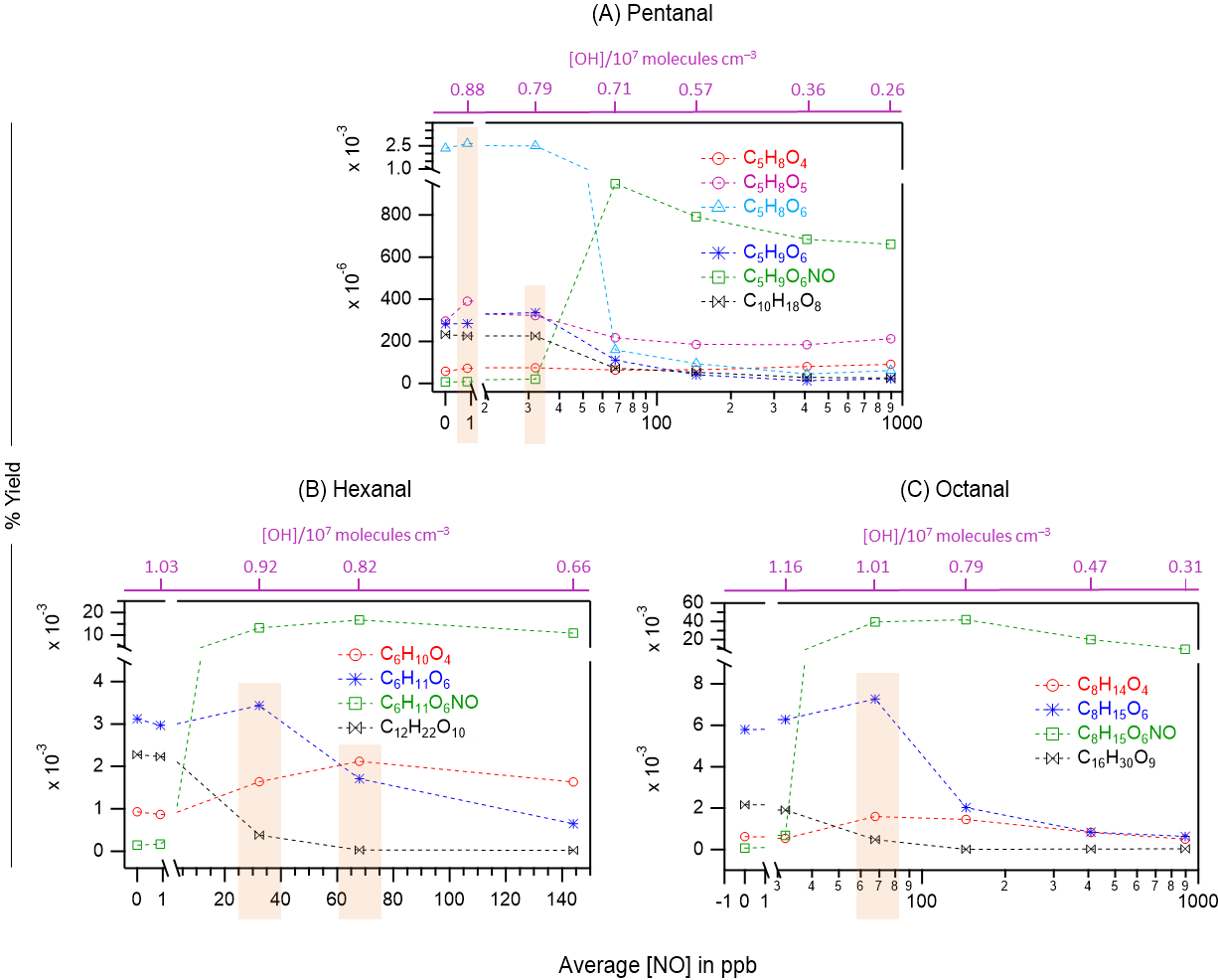 Figure 6The yields of different oxidation products including monomeric HOMs, organonitrates (green markers), and HOM accretion products (black markers) as a function of average NO concentrations in OH initiated oxidation of n-aldehydes: pentanal (a), hexanal (b), and octanal (c). The corresponding average OH radical concentrations in these experiments are shown with purple scales. Note the logarithmic scale (x-axis) in panels (a) and (c). The orange rectangles highlight the enhanced yields of several non-nitrogen containing products: O4–O6 closed-shell products from pentanal under around 1 ppb NO (a), O4 closed-shell products from hexanal and octanal under around 70 ppb NO (b, c), O6 peroxy radical from pentanal and hexanal under around 30 ppb NO (a, b) and the same from octanal under 70 ppb NO (c). Reaction time, Δt = 11–13 s.