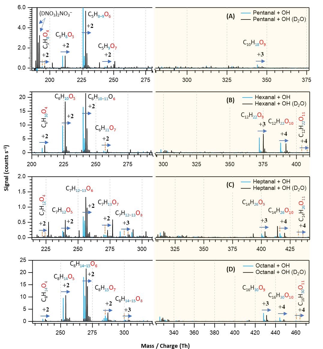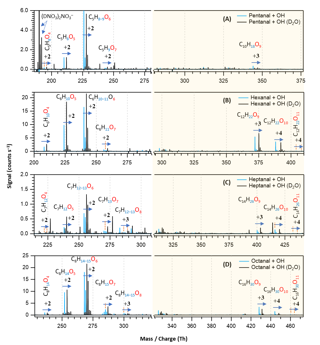 Figure 7Overlaid nitrate chemical ionization mass spectra of OH initiated oxidation of n-aldehydes without (in blue) and with the presence of D2O (in black): pentanal (a), hexanal (b), heptanal (c), and octanal (d). In panel (a), the label is assigned to the deuterated nitric acid trimer reagent signal. The product peaks are labelled with the exclusion of ion attachment in their compositions and the numbers on the blue arrows indicate the individual counts of mass shift during exchange. The backgrounds of TME ozonolysis (TME + O3) and aldehyde have been subtracted from the spectra, resulting in several negative peaks in panels (a) and (b). The accretion product region is highlighted in light gold background.