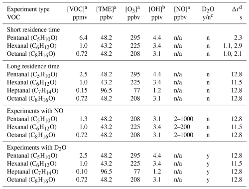 a Initial reactant concentrations. b The initial OH concentrations were calculated using bimolecular rate coefficients = 1.5 × 10−15 , kOH−TME = 1.0 × 10−10 (Manion et al., 2015), and the expression . n/a = not applicable. c D2O added = y, not added = n. d Reaction time (Δt).