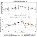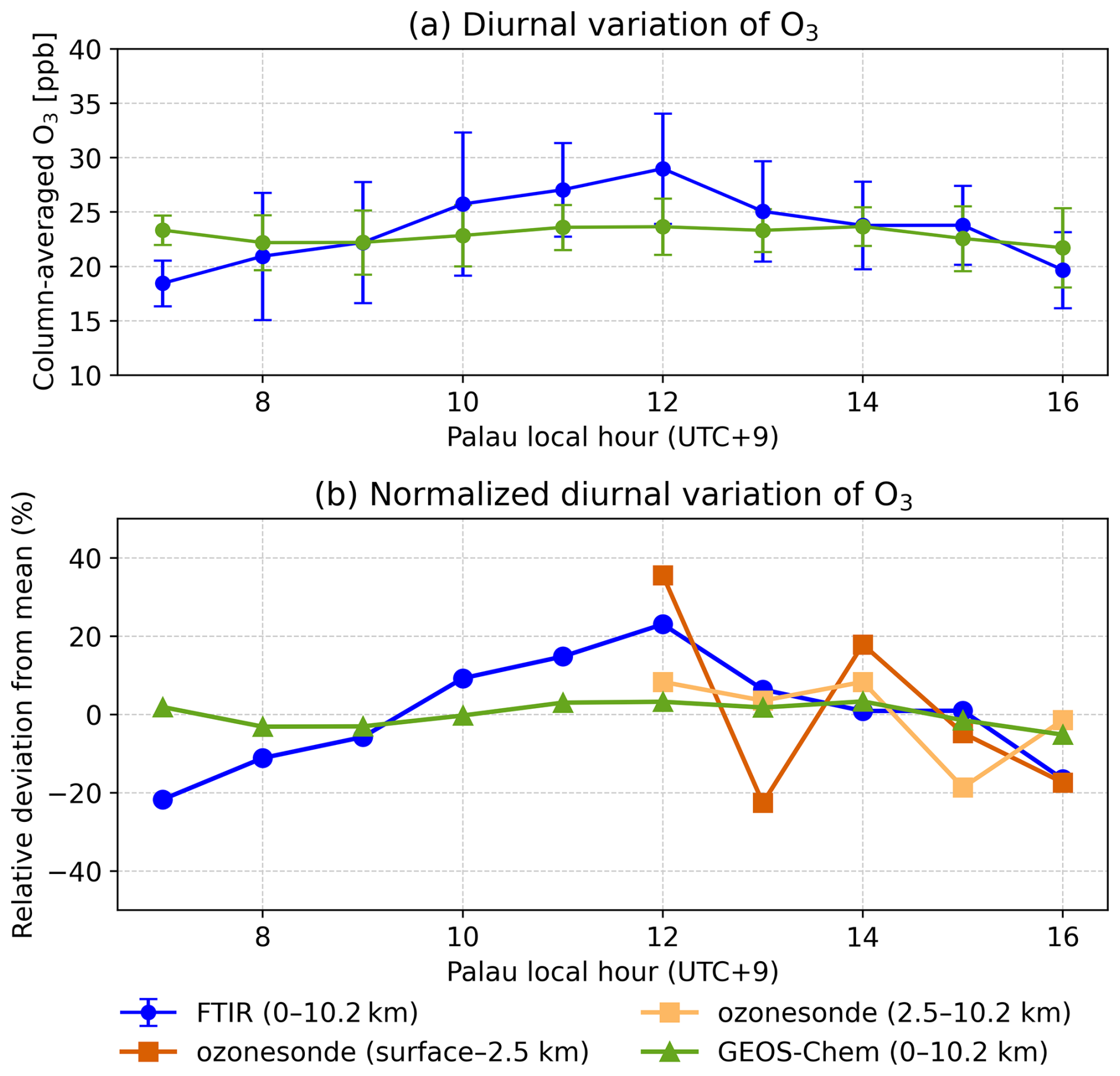 Figure 3(a) Diurnal variation of tropospheric column of O3 (TOC) from FTIR measurement and GEOS-Chem (smoothed with AVKs). Error bars denote ±1σ variability within each hourly bin. (b) Normalized diurnal variation of O3 from FTIR TOC, GEOS-Chem, and ozonesonde volume mixing ratios from surface–2.5 and 2.5–10.2 km. Normalized values are calculated relative to the mean of each dataset (see Sect 2.5.1). Absolute values of ozonesonde hourly mean are shown in Appendix C.