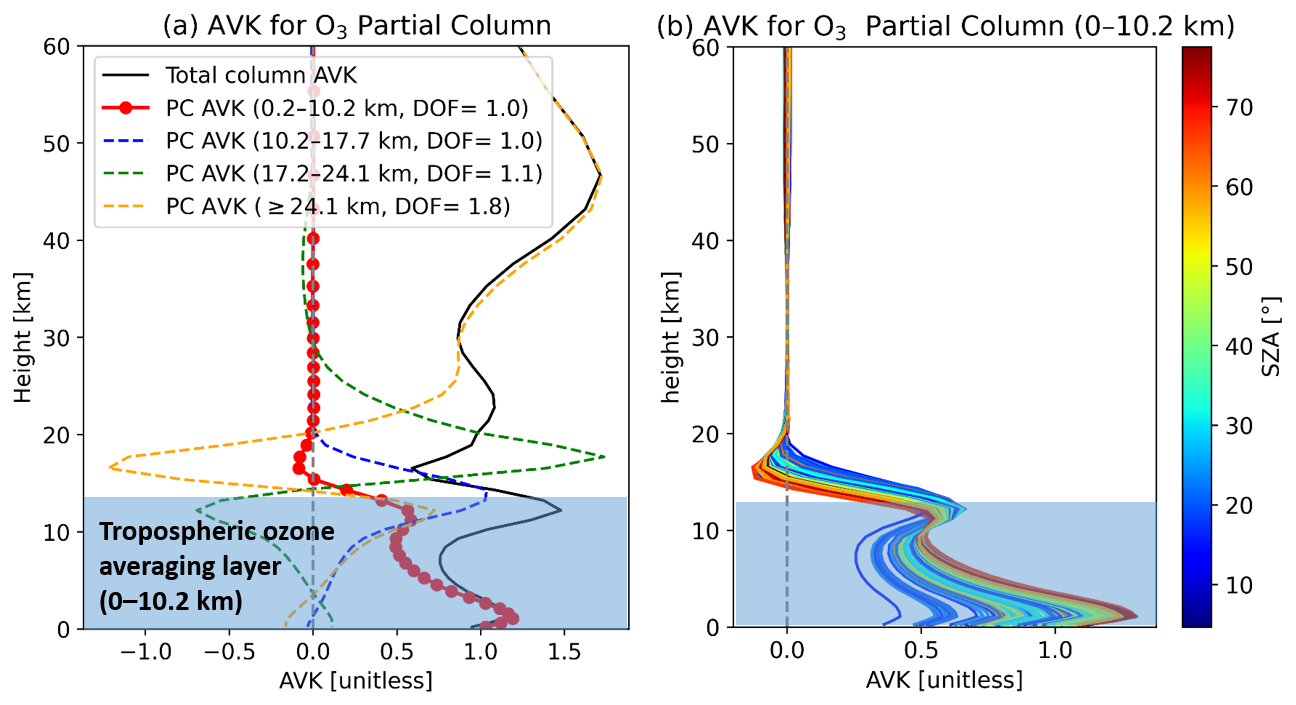 Figure 1(a) Partial column averaging kernels (PC AVKs) of O3 for different retrieval layers on 1 October 2022. The solid black line shows the total column AVK. Colored dashed lines indicate the PC AVKs corresponding to different degrees of freedom (DOFs): 0.2–10.2 km (DOF=1.0, red marked), 10.2–17.7 km (DOF=1.0, blue), 17.7–24.1 km (DOF=1.1, green), and ≥24.1km (DOF=1.8, orange). Red markers highlight the PC AVK for the tropospheric ozone partial column (0.2–10.2 km), which is the focus of this study. (b) Sensitivity of the first layer PC AVK (0.2–10.2 km) during the measurement period varies with solar zenith angle (SZA). Each colored line corresponds to a retrieval at a specific SZA, with the color scale on the right.
