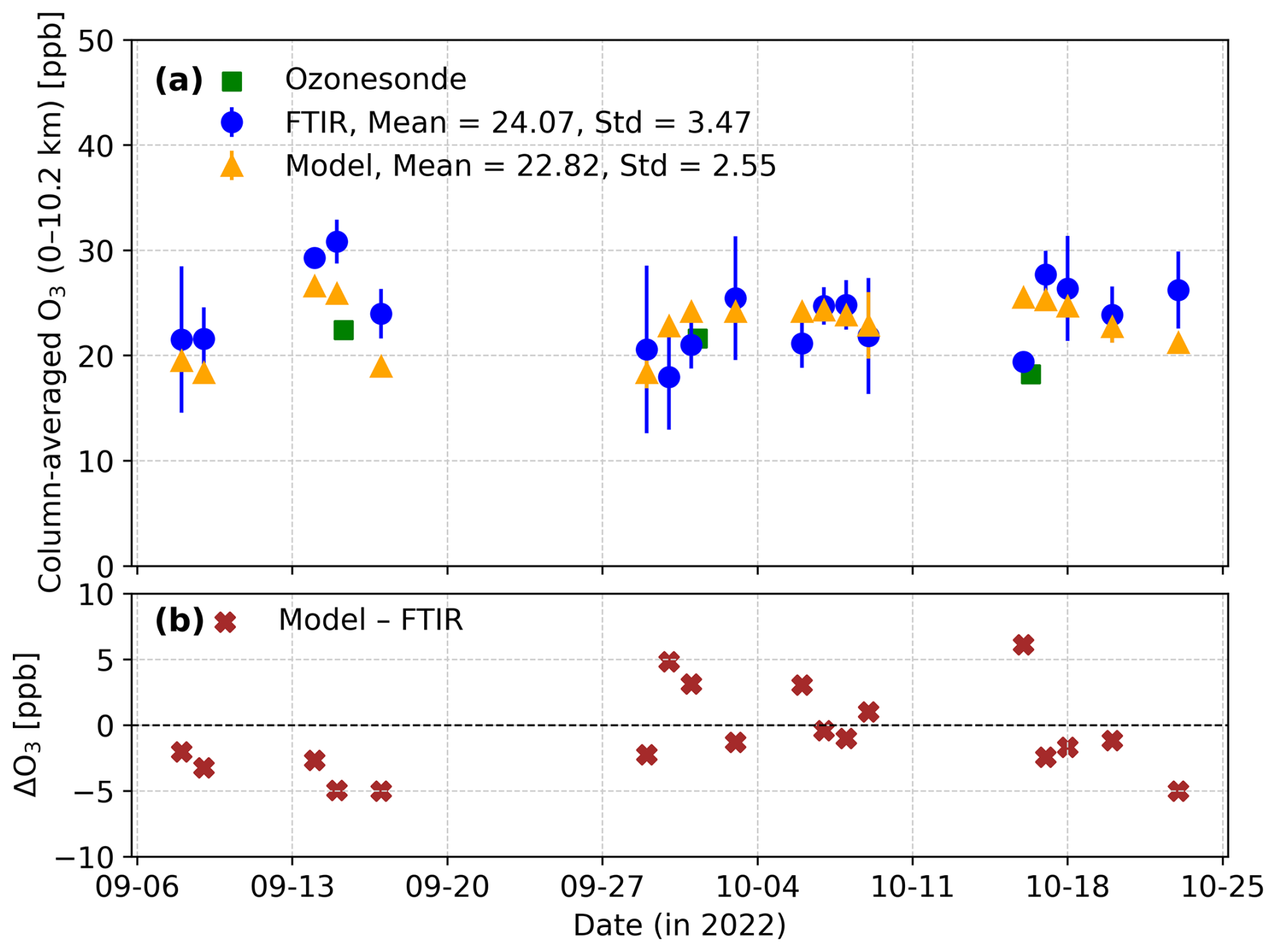 Figure 2(a) Time series of tropospheric O3 columns (ppb) from FTIR measurements, smoothed GEOS-Chem simulations, and smoothed ozonesonde profiles. (b) Daily differences between GEOS-Chem and FTIR (model – FTIR). All values represent dry-air partial columns averaged from the surface to 10.2 km. Ozonesonde and model profiles are interpolated to the FTIR grid and smoothed with the FTIR AVK before integrating 0–10.2 km to TOC.