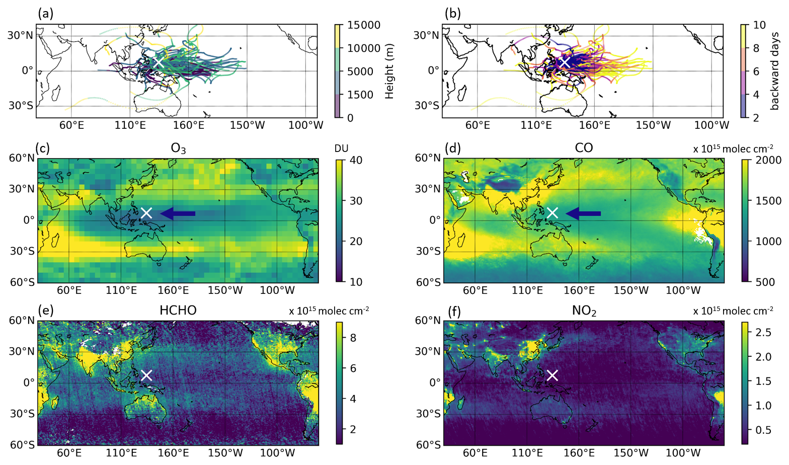 Figure 4(a–b) Ten-day backward trajectories initiated from Palau, color-coded by (a) altitude (m) and (b) backward time (d). (c–f) Satellite-derived tropospheric column of (c) O3, (d) CO, (e) HCHO, and (f) NO2. The white cross marks the location of Palau. The arrow in panels (c) and (d) indicates the mean transport pathway during the study period based on trajectory simulations.