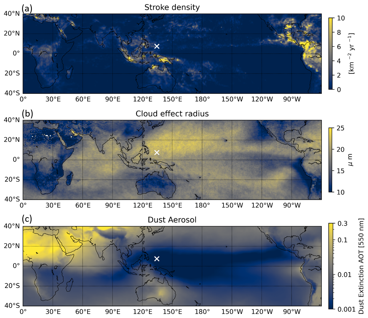 Figure 5Spatial distribution of (a) annual mean lightning stroke density (km-2yr-1) from WWLLN, (b) MODIS satellite derived cloud effective radius (µm) and (c) dust aerosol optical extinction (AOT) at 550 nm from MERRA-2 reanalysis. The white cross marks the location of Palau.
