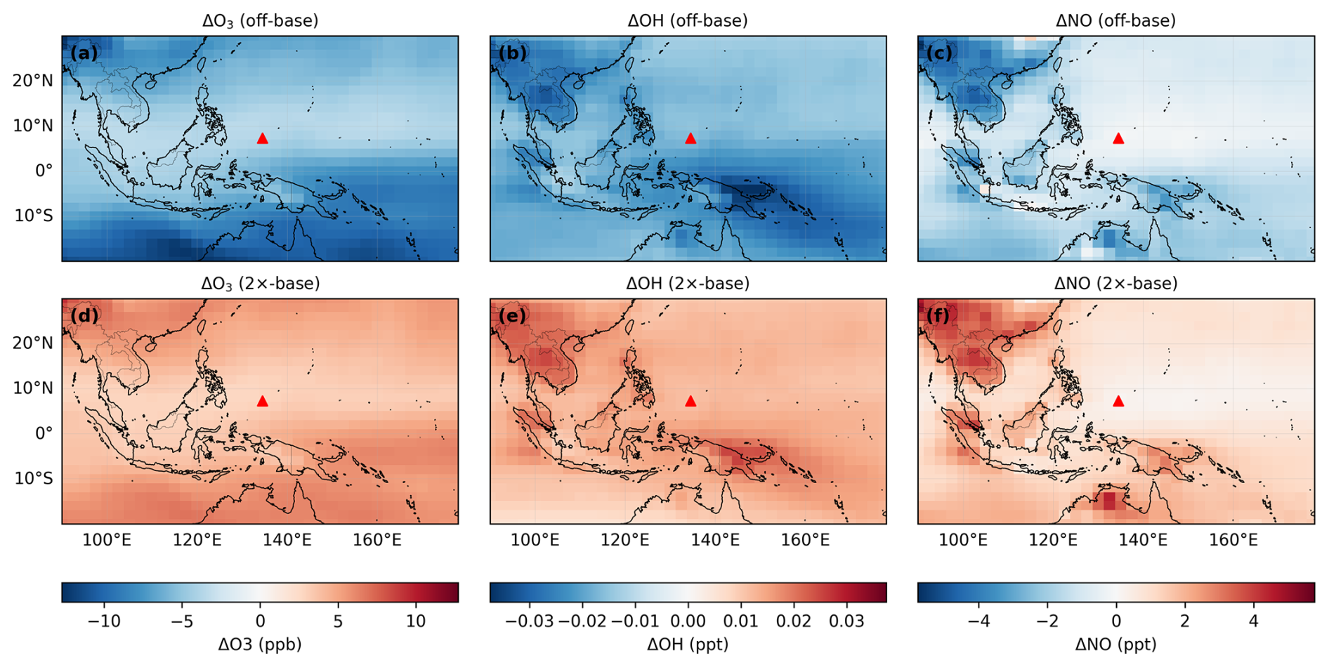 Figure 6Differences in tropospheric column–averaged mole fractions of O3, OH, and NO dry-air between LNOx sensitivity simulations and the base simulation. (a–c) the differences between the no-NOx simulation and the base simulation (no NOx minus base), and (d–f) the differences between the NOx simulation and the base simulation (NOx minus base). Columns correspond to O3, OH, and NO from left to right. The red triangle marks the location of the Palau FTIR measurement site. The absolute value of the simulation results are shown in Appendix C, Fig. C1.