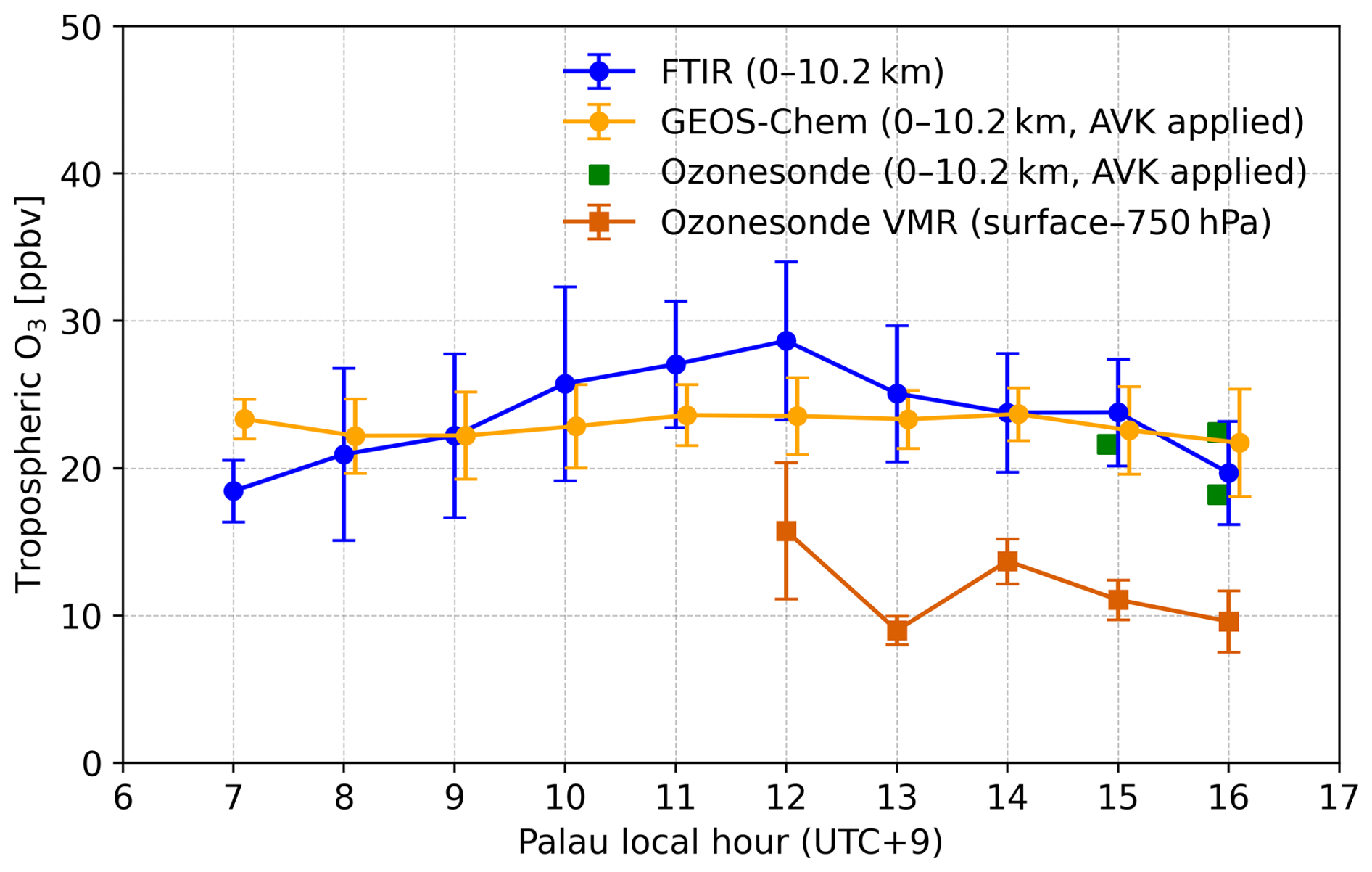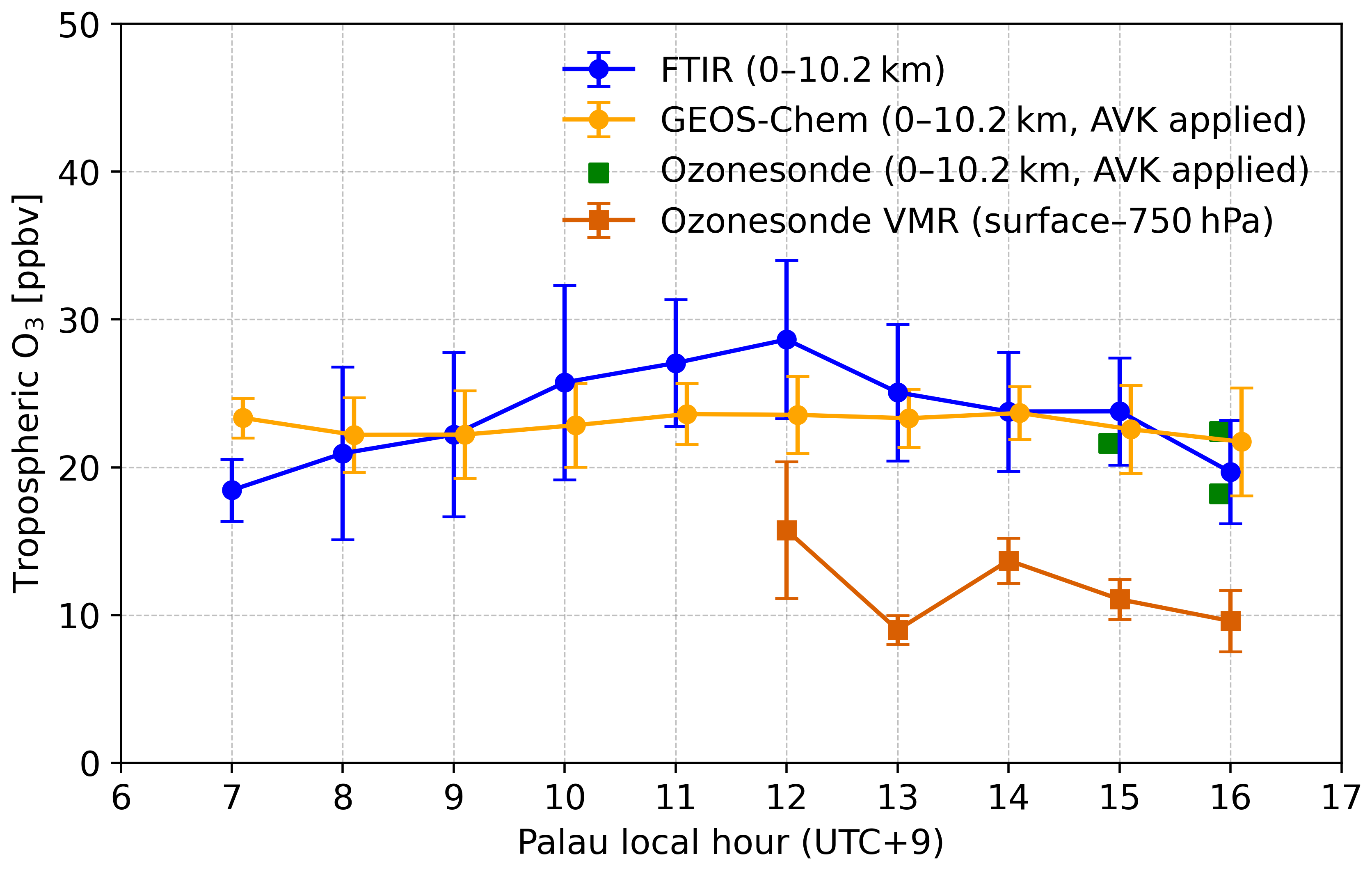 Previous studies have demonstrated characteristic diurnal surface ozone cycles in both urban and remote mid-latitude regions, driven predominantly by photochemical processes. For instance, Strode et al. (2019), Bernier et al. (2019), and (Xia et al.2021) reported daytime increases in surface ozone over the US and China, highlighting the role of local photochemistry under sufficient solar radiation and precursor availability. Similarly, observations from a remote high-altitude site in the Tibetan Plateau revealed a midday ozone maximum, further supporting the dominance of daytime photochemical production even in pristine environments (Yin et al.2017). Our measurements in TWP exhibit a comparable diurnal pattern in the tropospheric column, with ozone peaking around noon. Comparison with near-surface ozonesonde profiles further supports the presence of a midday enhancement. It should be emphasized, however, that the FTIR retrieval provides an integrated column signal (0–10.2 km), rather than a direct measurement of the surface. If the free troposphere exhibits little or no diurnal variability, then the signal detected in the integrated column likely reflects a surface-driven cycle that appears in muted form when averaged over the full tropospheric depth. Still, the FTIR TOC measurements in Palau capture the diurnal pattern, although the peak-to-peak amplitude is underestimated. The higher AVK sensitivity in the lower troposphere (Fig. 1) ensures that surface-driven variability is retained in the column retrieval rather than being fully smoothed out. This highlights that similar analyses at other FTIR sites must carefully consider the altitude-dependent sensitivity of the retrieval (AVK), as it determines how surface-driven diurnal variability is sufficiently reflected in the integrated column.