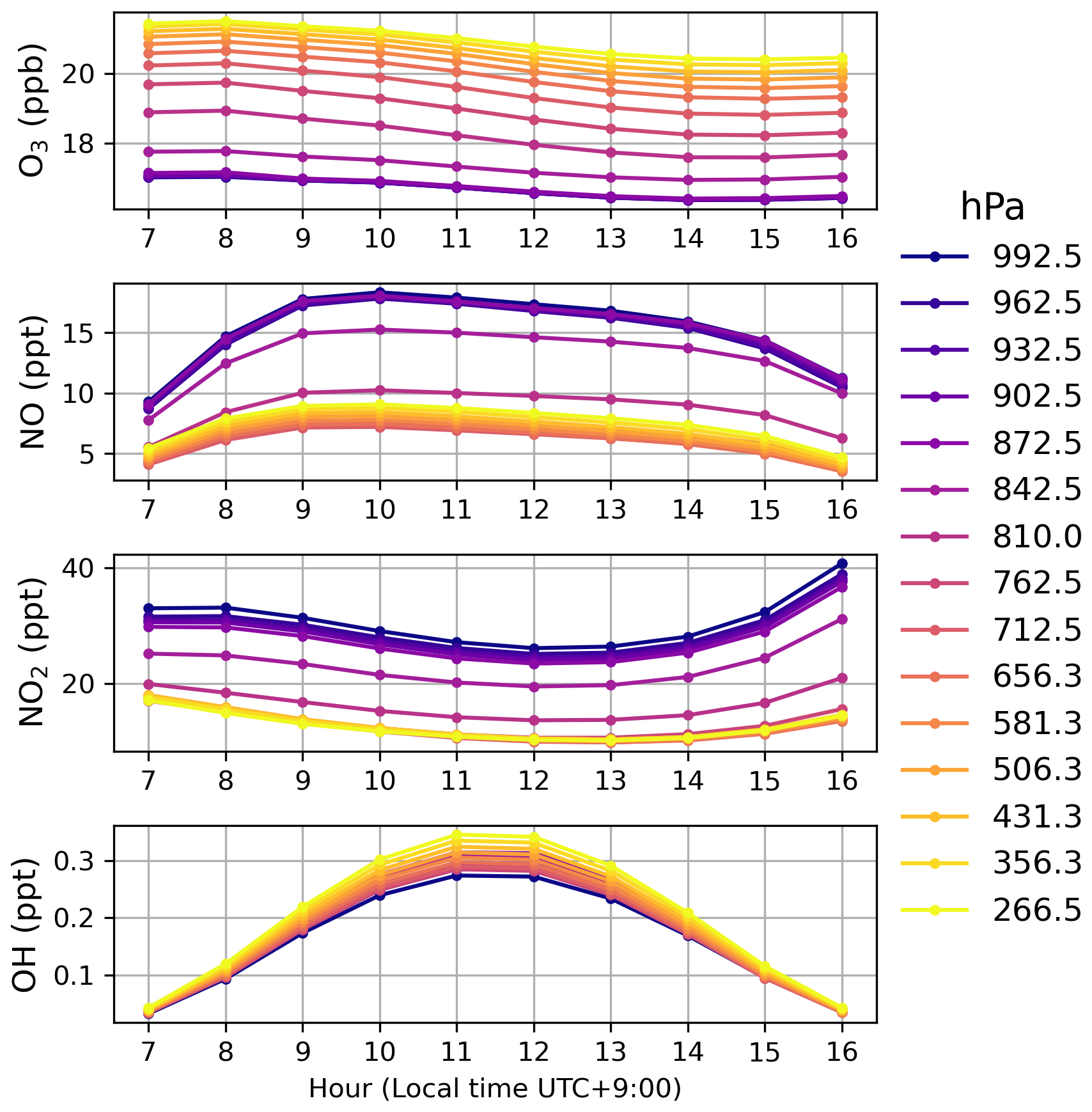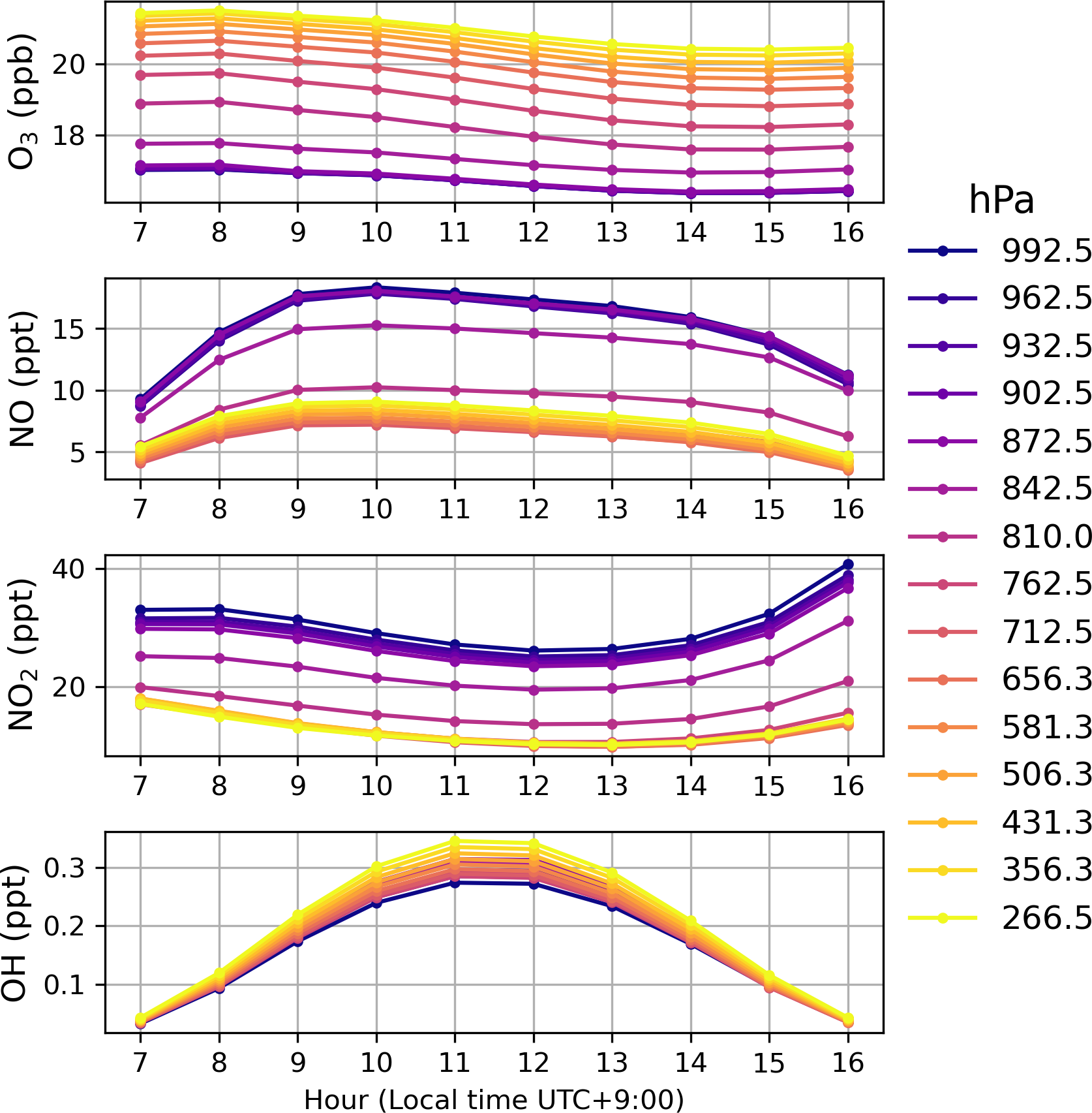 Many studies have explored the diurnal cycle of ozone, particularly in connection with surface-level photochemical production and removal processes (e.g. Chen et al.2024b; Strode et al.2019; Ou Yang et al.2012; Oltmans and Levy1994). These investigations span diverse environments, from urban centers to remote mountain observatories, and have revealed characteristic daily ozone maxima driven by solar radiation and precursor availability. In polluted continental areas, ozone typically shows nighttime minima due to dry deposition and titration by NO in the shallow nocturnal boundary layer, followed by afternoon peaks driven by photochemical production and mixing with ozone-rich residual layers (Monks2000; He et al.2023). In contrast, mountain sites often exhibit a reversed cycle, with nighttime maxima resulting from coupling with the free troposphere and daytime minima caused by the upslope transport of ozone-poor air from the boundary layer (Ou Yang et al.2012; Oltmans et al.2013). Over marine environments, especially under low NOx conditions, photolysis, HOx chemistry, and halogen reactions dominate, often leading to suppressed daytime ozone levels (Caram et al.2023). While surface ozone variability is well documented, the diurnal cycle of ozone in the tropospheric column or vertical profiles has received far less attention. The variation and magnitude of free-tropospheric ozone or the tropospheric column are generally considered smaller than those near the surface, owing to weaker photochemistry and the absence of dry deposition, as indicated by aircraft in situ profiles over Frankfurt (Petetin et al.2016). However, this has not been demonstrated in other regions, particularly in remote or oceanic environments, where conventional platforms such as balloon or aircraft campaigns provide limited temporal coverage.