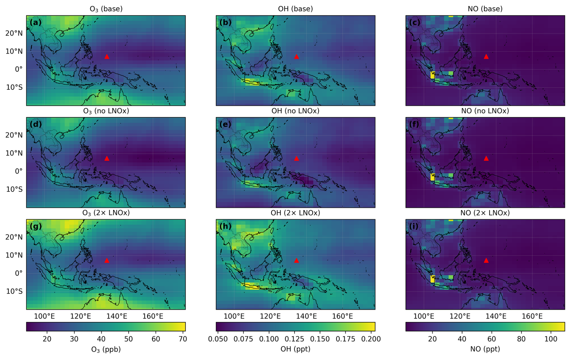 To quantify the role of lightning-produced nitrogen oxides (LNOx) in modulating tropospheric ozone over Palau, we performed two sensitivity simulations using the GEOS-Chem model by turning off and doubling LNOx emissions (Fig. 6). As shown in Sect. 3.3, lightning activity is negligible in the TWP region. Therefore, substantial perturbations to LNOx emissions, near-surface and free-tropospheric NO mixing ratios over the TWP exhibit little response (Fig. C1c–i). In contrast, pronounced responses to LNOx perturbations are evident over lightning-active regions such as northern Australia and the Maritime Continent.