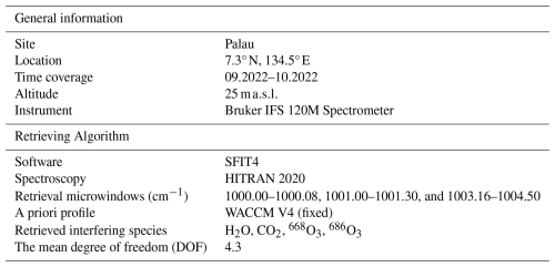 Since 2015, the Institute of Environmental Physics (IUP), University of Bremen, and Alfred-Wegener-Institut (AWI), Potsdam, have conducted atmospheric observations at the Palau Atmospheric Observatory (PAO) in Koror, Palau (7.3° N, 134.5° E) (Müller et al.2024a). PAO is located on the Palau Community College (PCC) campus. The O3 concentration was measured by solar absorption Fourier Transform infrared (FTIR) spectrometry in September and October 2022. The information of the FTIR measurement are given in Table 1. FTIR measurements have been performed in one of the PAO scientific containers using a Bruker IFS 120M spectrometer equipped with indium antimonide (InSb) since 2018. This allows to record spectra from 1900 up to 6000 cm−1. In August 2022, Mercury Cadmium Telluride (MCT) was installed to cover the spectral region between 700–3000 cm−1. The lower wavenumber region allows for the study of concentration profiles with higher precision, which is especially important for ozone.