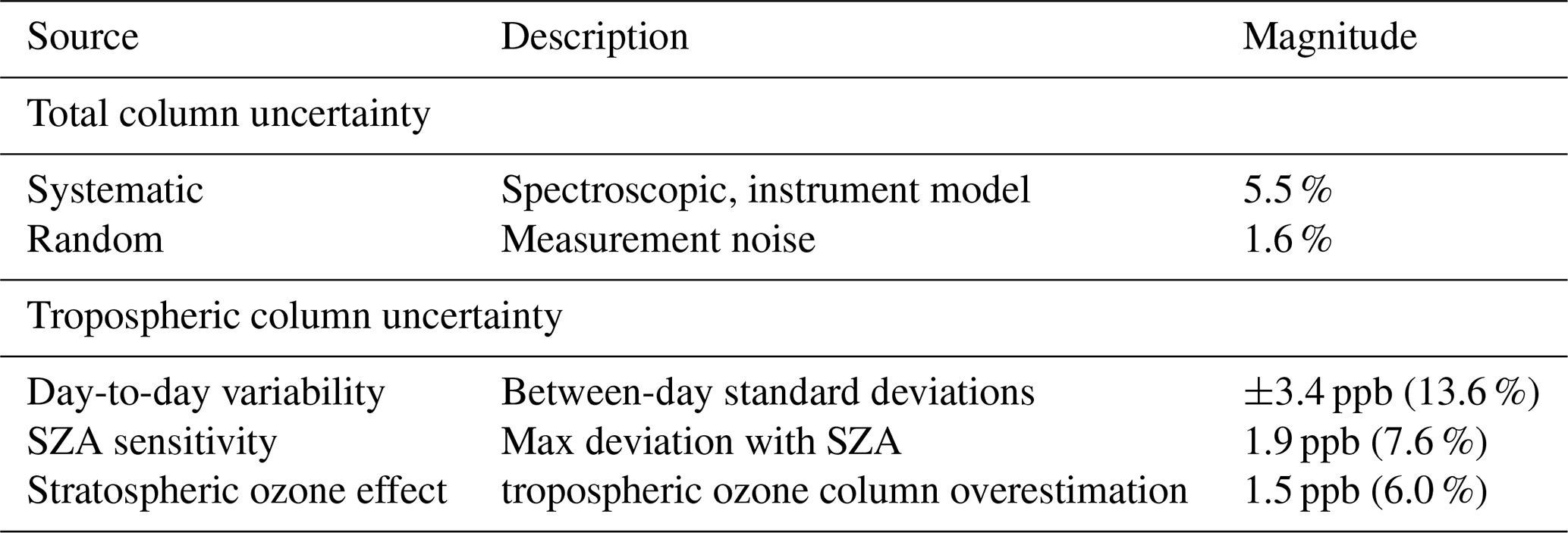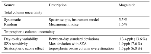 The uncertainty budget of our ozone retrievals includes different types of contributions as shown in Table 2. For the total column, systematic uncertainties from spectroscopy and instrument modeling amount to about 5.5 %, while random noise contributes 1.6 %. For the tropospheric column, the estimated uncertainties are of a different nature and therefore not directly additive. Day-to-day variability (±3.4ppb) reflects the representativeness of the retrievals.