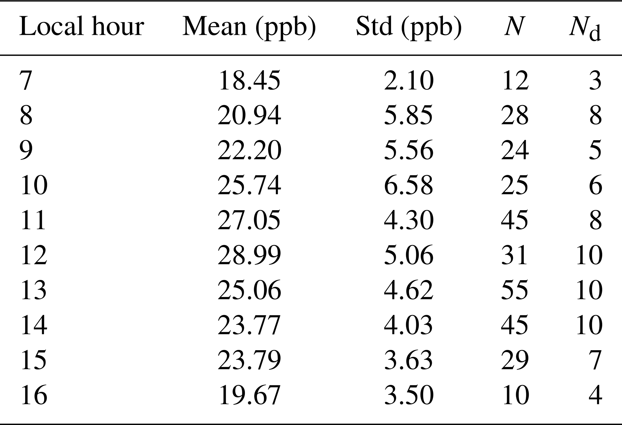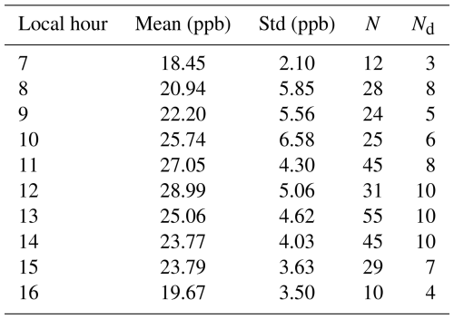 The FTIR spectra are recorded at a high spectral resolution up to 0.005 cm−1 by pointing the solar tracker at the sun during cloud-free weather conditions. The weather conditions can be actively monitored by the sky camera mounted above the window of the laboratory container to minimize the influence of clouds on solar absorption FTIR. We performed measurements throughout the day to record the spectrum from sunrise to sunset. The number of FTIR measurements contributing to each hourly bin ranges from 10 to 55, with the highest sampling between 11:00 and 14:00 LT. Each hourly bin includes measurements from multiple independent days (typically 3–10 d h−1, see Appendix A). The spectra collected after 17:00 LT were excluded from our analysis due to shading from a tree adjacent to the laboratory container. The measurements during the campaign period were grouped by hour and averaged to evaluate the diurnal cycle of O3. Therefore, we successfully obtained the ozone daytime diurnal cycle from 07:00 to 16:00 LT.