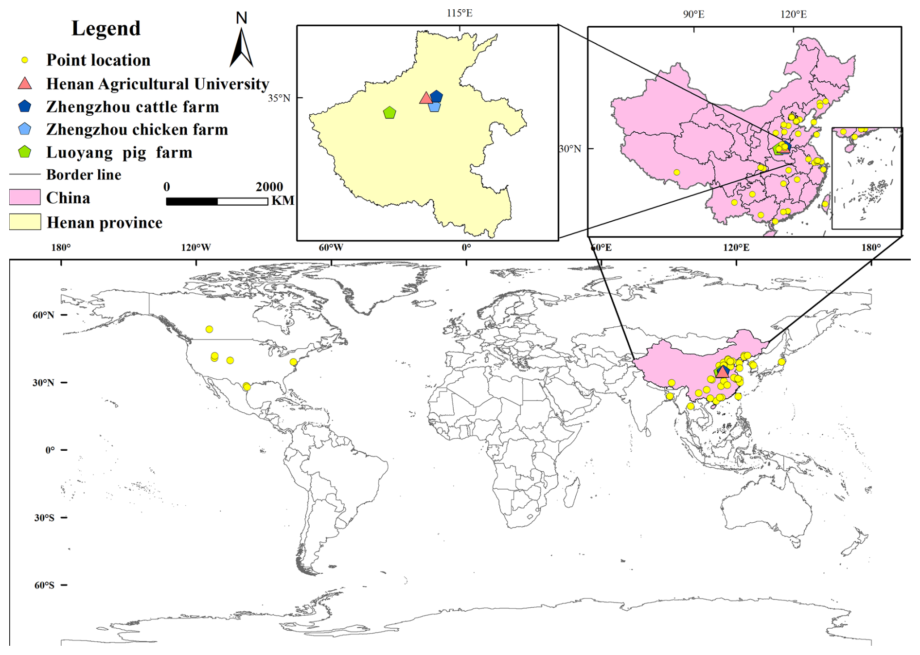Figure 1Sampling sites of livestock farms, haze weather, and clear weather in this study, extracted from the main research sampling locations. Yellow dots represent the main global research sampling sites, pink triangles represent sampling sites during haze and clear weather, dark blue pentagons represent cattle farms, light blue pentagons represent layer farms, and green pentagons represent fattening pig farms.