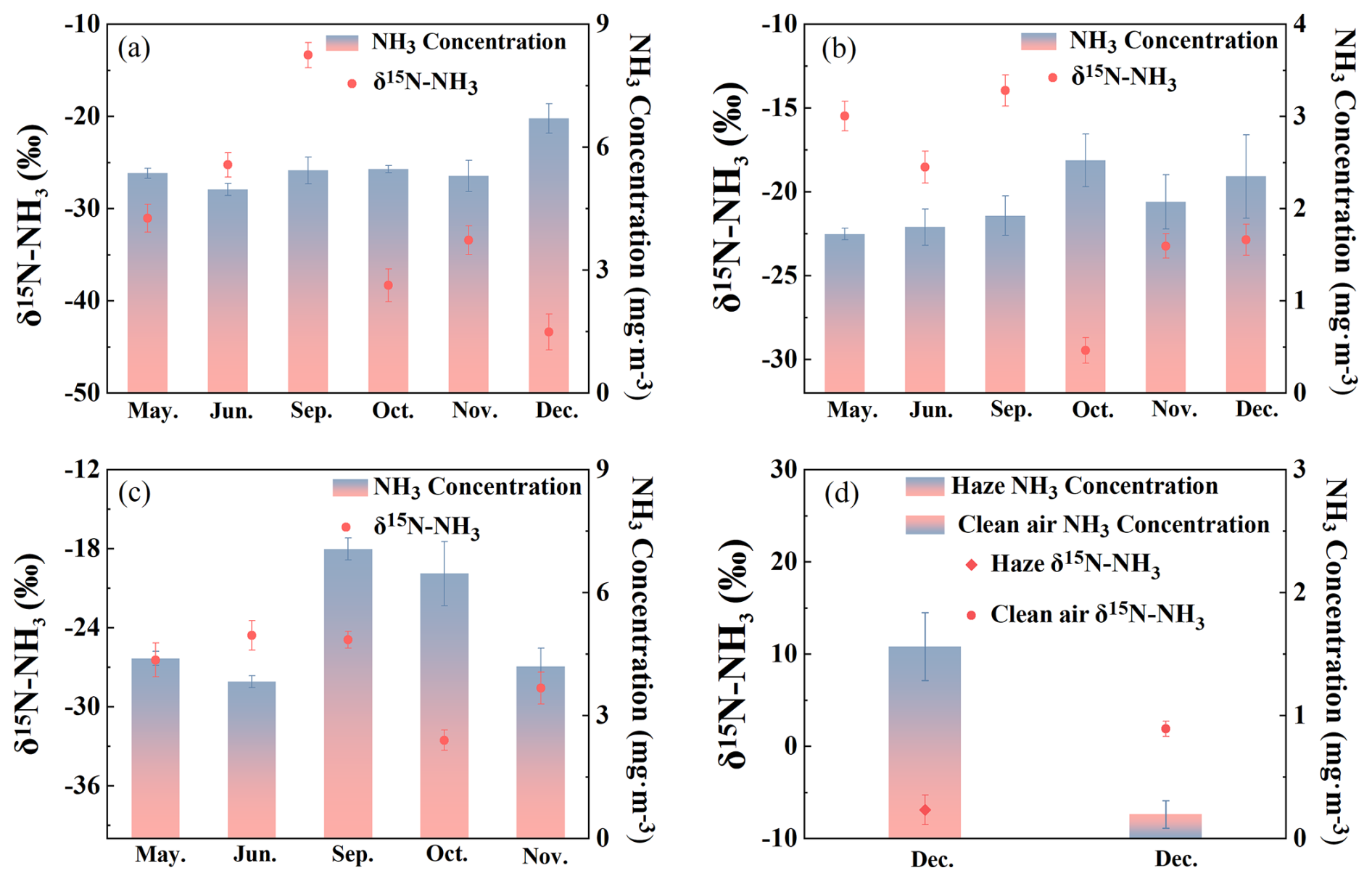 Numerous studies have employed stable nitrogen isotope (δ15N) techniques to quantify the contributions of combustion, transportation, and agricultural activities to atmospheric NH3 and NH4+ (Xiang et al., 2022; Xie et al., 2008). For example, during the corn growing season in Northeast China, δ15N values of NH3 volatilized from farmland exhibited a wide range, from 38.0 ‰ to 0.2 ‰. Notably, δ15N emission rates were considerably lower during the early stages of corn growth compared to later stages, indicating clear seasonal variation (Song et al., 2024). Under different fertilization regimes, significant differences in δ15N-NH3 emissions were observed, with values fluctuating between 46.0 ‰ and 4.7 ‰ throughout the volatilization period (Ti et al., 2021). Previous studies report that δ15N-NH3 and δ15N-NH4+ emissions from combustion sources (7.6 ‰ to +16.2 ‰) predominate in winter, contributing up to 51.6 % of total ammonia emissions (Xiao et al., 2022, 2025; Zhou et al., 2021). In contrast, NH3 emissions from vehicle exhaust exhibit relatively high δ15N values (13.7 ± 3.7 ‰) (Savard et al., 2017; Xi et al., 2023). However, these emissions are primarily localized in urban environments.