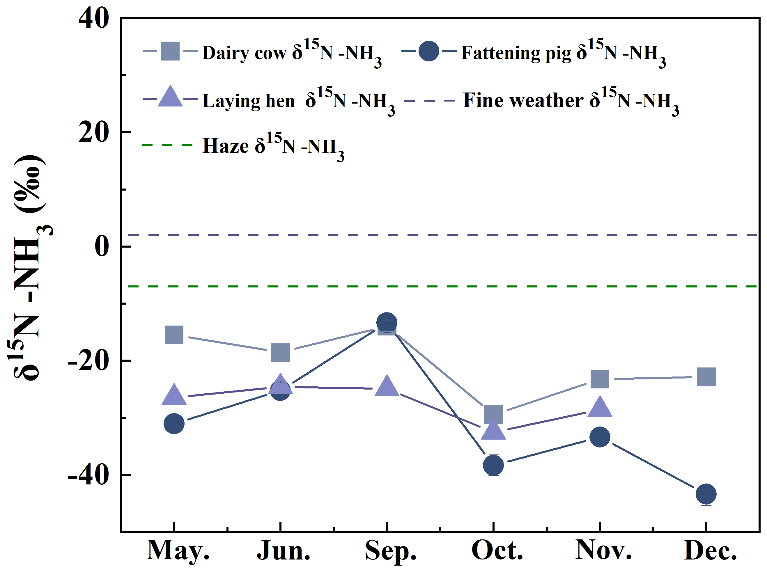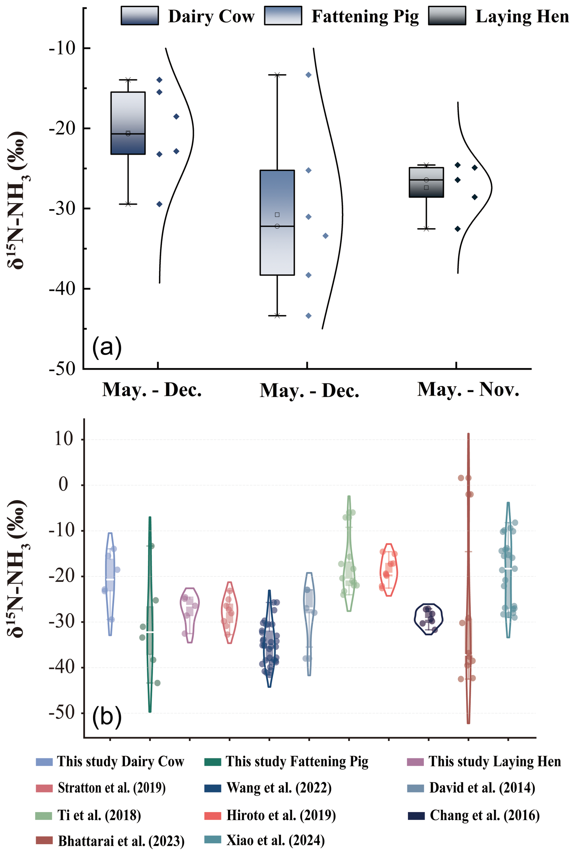 Currently, limited studies have reported the δ15N characteristics of ammonia from livestock and poultry farming. Existing data mostly rely on passive sampling methods (Berner and David Felix, 2020; Chang et al., 2016; Ti et al., 2018), which assess δ15N changes by collecting wet deposition samples surrounding farms (pig farms: 35.1 ‰ to 10.5 ‰; cattle farms: 24.7 ‰ to 11.3 ‰). Additional research has quantified δ15N variability in livestock and poultry (31.0 ‰ to 15.0 ‰) through simulated ammonia emissions during manure management processes (Hristov et al., 2009). It is noteworthy that δ15N-NH3 fluctuations in livestock and poultry operations may also depend on animal growth stages and reproductive status