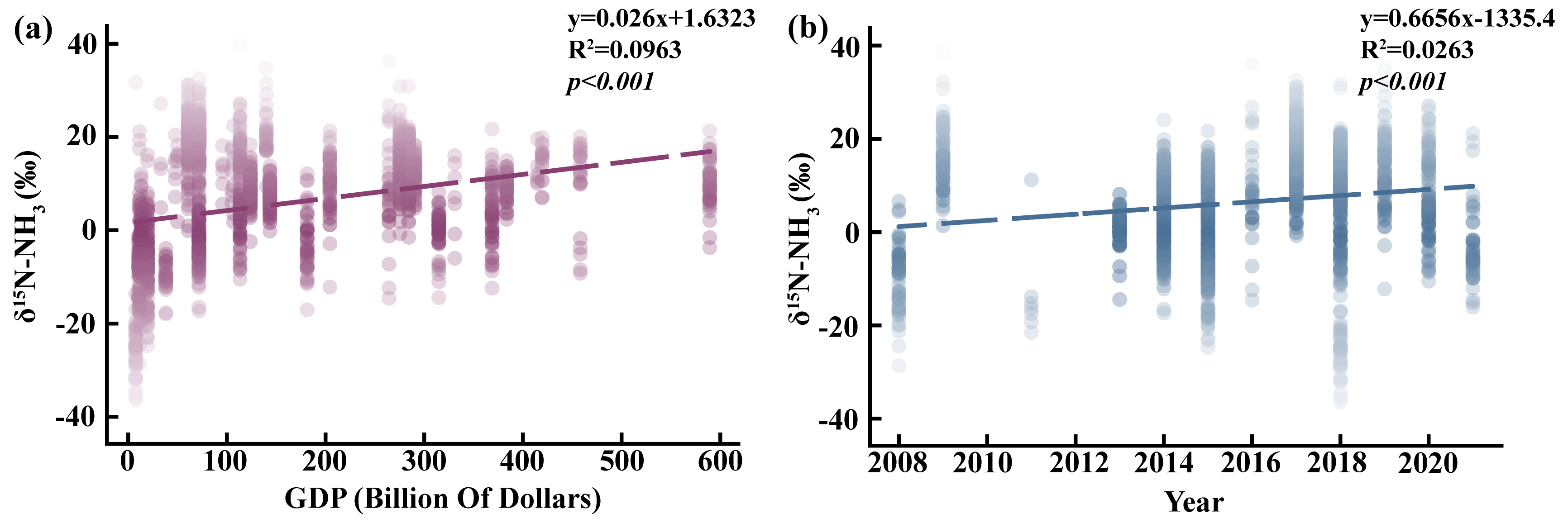 Figure 5Changes of δ15N-NH4+ values among different GDP cities and years. (a) The relationship between GDP and δ15N-NH4+ values (p<0.001); (b) Changes of δ15N-NH4+ values reported between 2008 to 2021 (p<0.001).